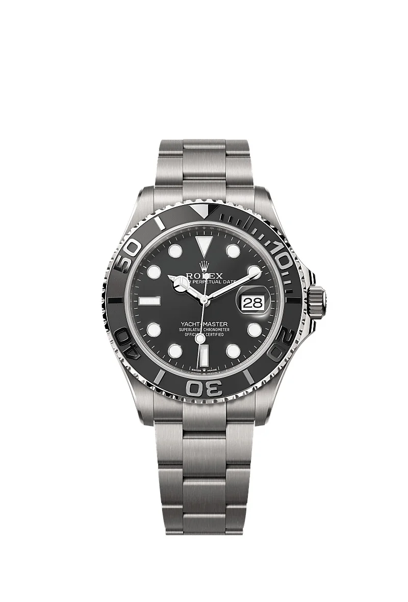 Oyster, 42 mm, RLX titanium Reference226627 Staying on course The Oyster PerpetualYacht-Master 42inRLX titaniumwithan intense blackdial andan Oysterbracelet. Bidirectional Rotatable Bezel Timing the distance The Yacht-Master’s bidirectional rotatable 60-minute graduated bezel is made entirely from precious metals or fitted with a Cerachrom insert in high-tech ceramic. The raised polished numerals and graduations stand out clearly against a matt, sand-blasted background. This functional bezel – which allows the wearer to calculate, for example, the sailing time between two buoys – is also a key component in the model’s distinctive visual identity. Intense black dial Exceptional legibility Like all Rolex Professional watches, the Yacht-Master 42 offers exceptional legibility in all circumstances, and especially in the dark, thanks to its Chromalight display. The broad hands and hour markers in simple shapes – triangles, circles, rectangles – are filled with a luminescent material emitting a long-lasting glow. RLX titanium Ultralight resistance RLX titanium is a grade 5 titanium alloy specially selected by Rolex. Like all titanium alloys, it is especially lightweight and is noted for its mechanical strength and corrosion resistance. Another characteristic of RLX titanium is the possibility of working it to give a polished or satin finish according to the brand’s specifications. Its high mechanical strength makes it complex to work with, and the decision to use it has required the introduction of special production processes. The Oyster bracelet Alchemy of form and function The Yacht-Master 42, made from RLX titanium, is fitted on an Oyster bracelet. Developed at the end of the 1930s, this three-piece link bracelet remains the most universal in the Oyster Perpetual collection and is known for its robustness. The Oyster bracelet of this new version of the Yacht-Master 42 features the Oysterlock folding safety clasp, which prevents accidental opening. It is also equipped with the Easylink comfort extension link, developed by Rolex, which allows the wearer to easily adjust the bracelet length by approximately 5 mm. The Oyster bracelet in RLX titanium also includes patented ceramic inserts – designed by the brand – inside the links to enhance its flexibility on the wrist and its longevity.