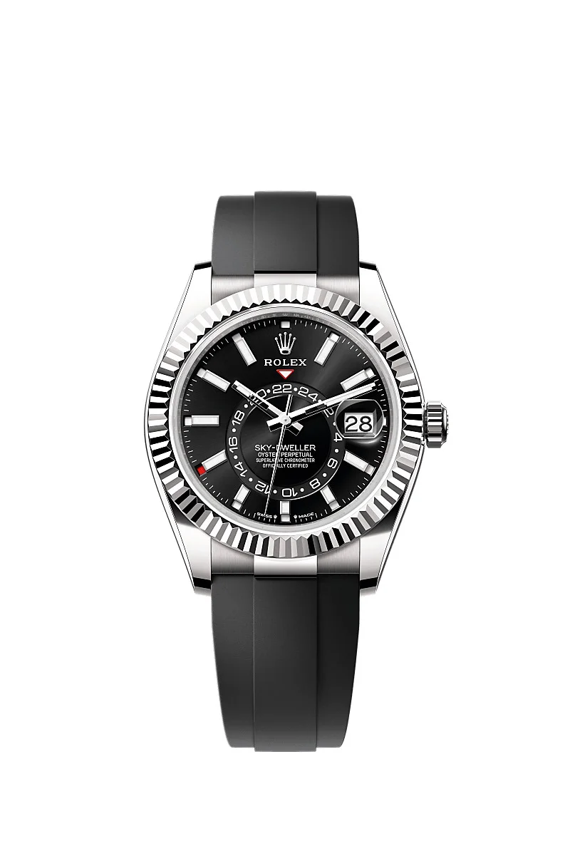 Oyster, 42 mm, white gold Reference336239 High-flying The Oyster PerpetualSky-Dwellerin18 ct white goldwitha bright blackdial andan Oysterflexbracelet. The Oysterflex Bracelet Highly resistant and durable The Sky-Dweller’s new Oysterflex bracelet, developed by Rolex and patented, offers a sporty alternative to metal bracelets. The bracelet attaches to the watch case and the Oysterclasp by a flexible titanium and nickel alloy metal blade. The blade is overmoulded with high-performance black elastomer which is particularly resistant to environmental effects, very durable and perfectly inert for the wearer of the watch. For enhanced comfort, the inside of the Oysterflex bracelet is equipped with a patented longitudinal cushion system that stabilizes the watch on the wrist and fitted with an 18 ct white gold Oysterclasp. It also features the Rolex Glidelock extension system, designed by the brand and patented. This inventive toothed mechanism, integrated beneath the clasp, allows fine adjustment of the bracelet length by some 15 mm in increments of approximately 2.5 mm, without the use of tools. 18 ct white gold Commitment to excellence By operating its own exclusive foundry, Rolex has the unrivalled ability to cast the highest quality 18 ct gold alloys. According to the proportion of silver, copper, platinum or palladium added, different types of 18 ct gold are obtained: yellow, pink or white. They are made with only the purest metals and meticulously inspected in an in-house laboratory with state-of-the-art equipment, before the gold is formed and shaped with the same painstaking attention to quality. Rolex's commitment to excellence begins at the source. Bright black dial A striking characteristic A fixed inverted red triangle on the dial points to the chosen reference time – the time at home or at the traveller’s usual workplace – on the off-centre 24-hour disc. At a glance, this 24-hour display clearly distinguishes daytime hours from night-time hours in the other time zone. A deep red rectangle in one of the 12 windows around the dial indicates the current month, a striking characteristic of the Saros annual calendar. This ingenious mechanism simplifies life for the wearer of the watch, who no longer needs to think about adjusting the date at the end of a 30-day month. The annual calendar displays the correct date through the year. Only one adjustment is needed – on 1 March (February having only 28 or 29 days). The date is connected to local time and automatically changes according to the traveller’s local time zone. The Fluted Bezel A Rolex signature The Rolex fluted bezel is a mark of distinction. Originally, the fluting of the Oyster bezel had a functional purpose: it served to screw the bezel onto the case, helping to ensure the waterproofness of the watch. It was therefore identical to the fluting on the case back, which was also screwed onto the case for waterproofness, using specific Rolex tools. Over time, the fluting became an aesthetic element, a genuine Rolex signature feature. Today the fluted bezel is a mark of distinction, always in gold. The Sky-Dweller is equipped with a mechanism of interaction between the rotatable bezel, the winding crown and the movement: the Ring Command system, which allows the user to select the watch's functions one-by-one and to set them easily, quickly and securely.