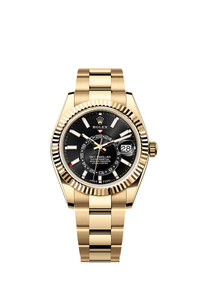 Oyster, 42 mm, yellow gold Reference336938 High-flying The Oyster PerpetualSky-Dwellerin18 ct yellow goldwitha bright blackdial andan Oysterbracelet. Bright black dial A striking characteristic A fixed inverted red triangle on the dial points to the chosen reference time – the time at home or at the traveller’s usual workplace – on the off-centre 24-hour disc. At a glance, this 24-hour display clearly distinguishes daytime hours from night-time hours in the other time zone. A deep red rectangle in one of the 12 windows around the dial indicates the current month, a striking characteristic of the Saros annual calendar. This ingenious mechanism simplifies life for the wearer of the watch, who no longer needs to think about adjusting the date at the end of a 30-day month. The annual calendar displays the correct date through the year. Only one adjustment is needed – on 1 March (February having only 28 or 29 days). The date is connected to local time and automatically changes according to the traveller’s local time zone. The Fluted Bezel A Rolex signature The Rolex fluted bezel is a mark of distinction. Originally, the fluting of the Oyster bezel had a functional purpose: it served to screw the bezel onto the case, helping to ensure the waterproofness of the watch. It was therefore identical to the fluting on the case back, which was also screwed onto the case for waterproofness, using specific Rolex tools. Over time, the fluting became an aesthetic element, a genuine Rolex signature feature. Today the fluted bezel is a mark of distinction, always in gold. The Sky-Dweller is equipped with a mechanism of interaction between the rotatable bezel, the winding crown and the movement: the Ring Command system, which allows the user to select the watch's functions one-by-one and to set them easily, quickly and securely. 18 ct yellow gold Commitment to excellence By operating its own exclusive foundry, Rolex has the unrivalled ability to cast the highest quality 18 ct gold alloys. According to the proportion of silver, copper, platinum or palladium added, different types of 18 ct gold are obtained: yellow, pink or white. They are made with only the purest metals and meticulously inspected in an in-house laboratory with state-of-the-art equipment, before the gold is formed and shaped with the same painstaking attention to quality. Rolex's commitment to excellence begins at the source. The Oyster bracelet Alchemy of form and function The Sky-Dweller is fitted on a solid-link Oyster bracelet in Oystersteel, in the case of the white Rolesor version, or, for the yellow Rolesor version, an Oyster bracelet combining Oystersteel and yellow gold. The Oyster bracelet benefits from the new concealed attachment system beneath the bezel which ensures seamless visual continuity between the bracelet and case. It is equipped with a folding Oysterclasp and also features the ingenious patented Easylink rapid extension system that allows the wearer to easily increase the bracelet length by approximately 5 mm, for additional comfort in any circumstance.