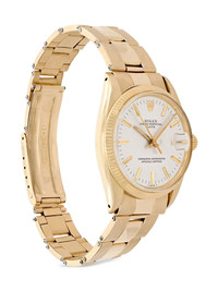 Oyster Perpetual 34mm Highlights - Silver-tone dial - 14k yellow gold - 34mm - Fluted bezel - Round case shape - Date feature - Silver baton markers - Automatic movement - Screw-down crown - Original box included - This item comes with a standard one-year warranty from the boutique. - Condition: excellent. this previously owned item is in near-perfect condition with no signs of damage or use. Imported Composition 14kt Yellow Gold 100% SIZE & FIT Measurement Case size 1.33 in(34 mm) Case thickness 0.04 in(1.1 mm)