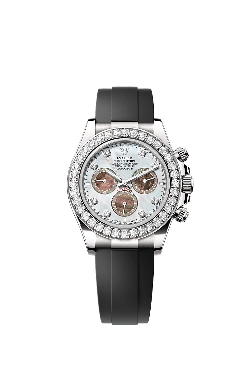 The Oysterflex Bracelet Highly resistant and durable The 18 ct gold versions of the Cosmograph Daytona with a Cerachrom bezel are available with an Oysterflex bracelet. Developed by Rolex and patented, it singularly combines the robustness of a metal bracelet with the comfort of an elastomer bracelet. It is made up of two flexible curved metal blades – one in each bracelet section – overmoulded with high-performance black elastomer. For optimum comfort, the Oysterflex bracelet is equipped with cushions on its inner sides and an Oysterlock safety clasp to prevent accidental opening. Its length may be adjusted via the ingenious Rolex Glidelock extension system. 18 ct white gold Commitment to excellence By operating its own exclusive foundry, Rolex has the unrivalled ability to cast the highest quality 18 ct gold alloys. According to the proportion of silver, copper, platinum or palladium added, different types of 18 ct gold are obtained: yellow, pink or white. They are made with only the purest metals and meticulously inspected in an in-house laboratory with state-of-the-art equipment, before the gold is formed and shaped with the same painstaking attention to quality. Rolex's commitment to excellence begins at the source. Mother-of-Pearl Dial A unique effect The contrasting dial is made from natural mother-of-pearl and graced with eight diamonds and three Chromalight hour markers. The strength of the contrast, the intensity of the colours and the depth of the reflections are the result of a particularly stringent material selection process. Both varieties of mother-of-pearl are handled with the greatest care by the brand’s artisans. The dial allows drivers to accurately map out their track times and tactics without fail. Diamond-set bezel Adorning a legendary chronograph The timepiece incorporates a bezel adorned with 36 brilliant-cut diamonds. This now legendary chronograph is the instrument of choice for measuring time intervals and determining average speeds. On this gem-set version, the emblematic tachymetric scale is replaced with diamonds.
