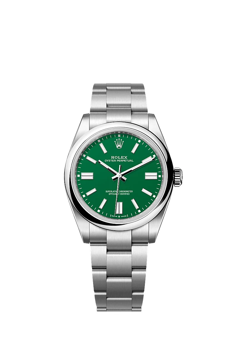 Green Dial Craftsmanship rhymes with high technology The colours created for the Oyster Perpetual range start life as a lacquer, which must be meticulously applied in a controlled-atmosphere environment to avoid dust and other contamination. The brass plate of the dial base receives layer upon layer of lacquer, six in all, to form a regular, uniform surface. The last step is varnishing and polishing to bring out the full brilliance and depth of colour. The various inscriptions are then pad printed, and the hour markers and crown riveted by hand. The dial, gleaming in its perfection, is all set to take its place on top of the movement at the watch assembly phase. Oystersteel Highly resistant to corrosion Rolex uses Oystersteel for its steel watch cases. Specially developed by the brand, Oystersteel belongs to the 904L steel family, alloys most commonly used in high-technology and in the aerospace and chemical industries, where maximum resistance to corrosion is essential. Oystersteel is extremely resistant, offers an exceptional finish once polished and maintains its beauty even in the harshest environments. The Oyster bracelet Alchemy of form and function The Oyster bracelet is a perfect alchemy of form and function, aesthetics and technology. First introduced in the late 1930s, this particularly robust and comfortable metal bracelet with its broad, flat three-piece links remains the most universal bracelet in the Oyster collection. For the Oyster Perpetual models the Oyster bracelet is fitted with an Oysterclasp.