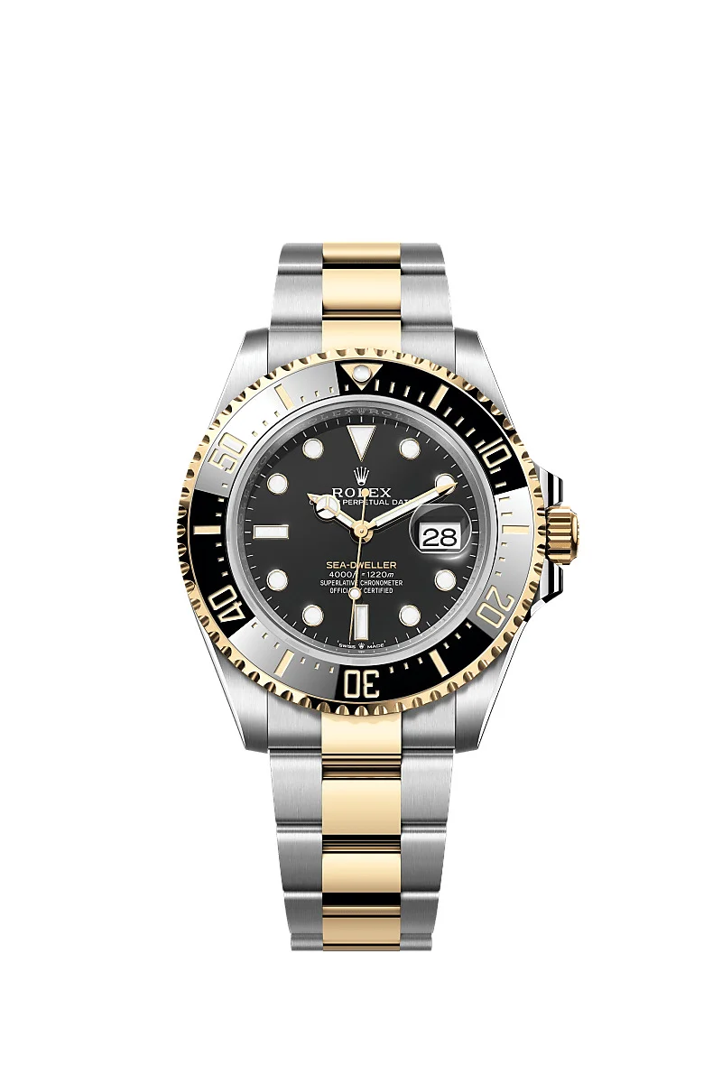 Oyster, 43 mm, Oystersteel and yellow gold Reference126603 Citizen of the deep The Oyster PerpetualSea-DwellerinOystersteel and yellow goldwith aCerachrom bezel insert in black ceramicandan Oysterbracelet. Ceramic Bezel and Luminescent Display Legendary divers’ watch The 60-minute graduated, unidirectional rotatable bezel of the Sea-Dweller enables divers to precisely and safely monitor their dive and decompression times. It is equipped with a patented black Cerachrom bezel insert manufactured by Rolex in a virtually scratchproof ceramic whose colour is unaffected by ultraviolet rays. The graduation is coated via PVD (Physical Vapour Deposition) with a thin layer of gold. The sleek black dial features large Chromalight hour markers and hands, filled with luminescent material that emits a long-lasting blue glow for excellent legibility in dark conditions. Intense black dial Inspired by the original The black dial of the Sea-Dweller has the large hands and indices reserved for Rolex professional models. The dial bears the name Sea-Dweller inscribed in a yellow hue, echoing the colour of the yellow gold. When the Sea-Dweller was updated in 2017, this lettering was in red, in reference to the original model. The innovative Chromalight display on the dial pushes back the boundaries of visibility in dark environments. Its distinctive blue glow lasts up to eight hours with a uniform luminosity, practically twice as long as that of standard luminescent materials. Yellow Rolesor A meeting of two metals Gold is coveted for its lustre and nobility. Steel reinforces strength and reliability. Together, they harmoniously combine the best of their properties. A true Rolex signature, Rolesor has featured on Rolex models since the early 1930s, and was trademarked as a name in 1933. It is one of the prominent pillars of the Oyster collection. The Oyster bracelet Alchemy of form and function The Oyster bracelet is a perfect alchemy of form and function, aesthetics and technology, designed to be both robust and comfortable. It is equipped with an Oysterlock clasp, which prevents accidental opening, and an ingenious Glidelock, allowing fine adjustments of the bracelet without using any tools — and allowing it to be worn comfortably over a diving suit.