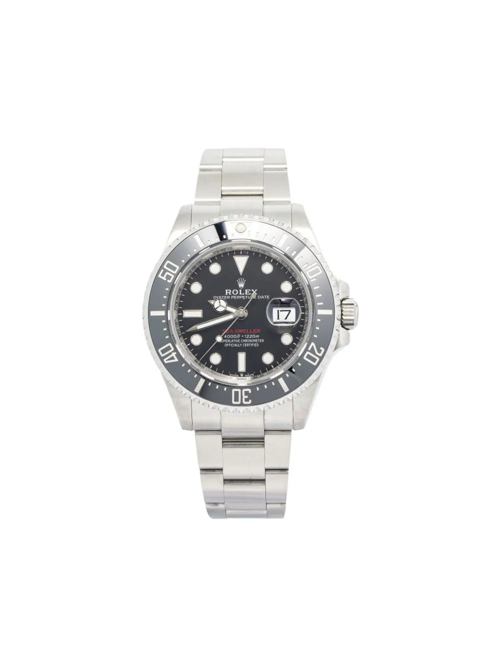 Sea-Dweller 43mm Highlights - Black dial - Round case - 43mm case size - Date window dial feature - Unidirectional rotating bezel - Self-winding movement - Screw-in crown - Oyster perpetual bracelet - The original box and papers are not included. - This item comes with a standard one-year warranty from the boutique. - Condition: excellent. this previously owned item is in near-perfect condition with no signs of damage or use. Imported Composition stainless steel 100% SIZE & FIT Measurement Case size 1.69 in(43 mm) Case thickness 0.61 in(15.5 mm)