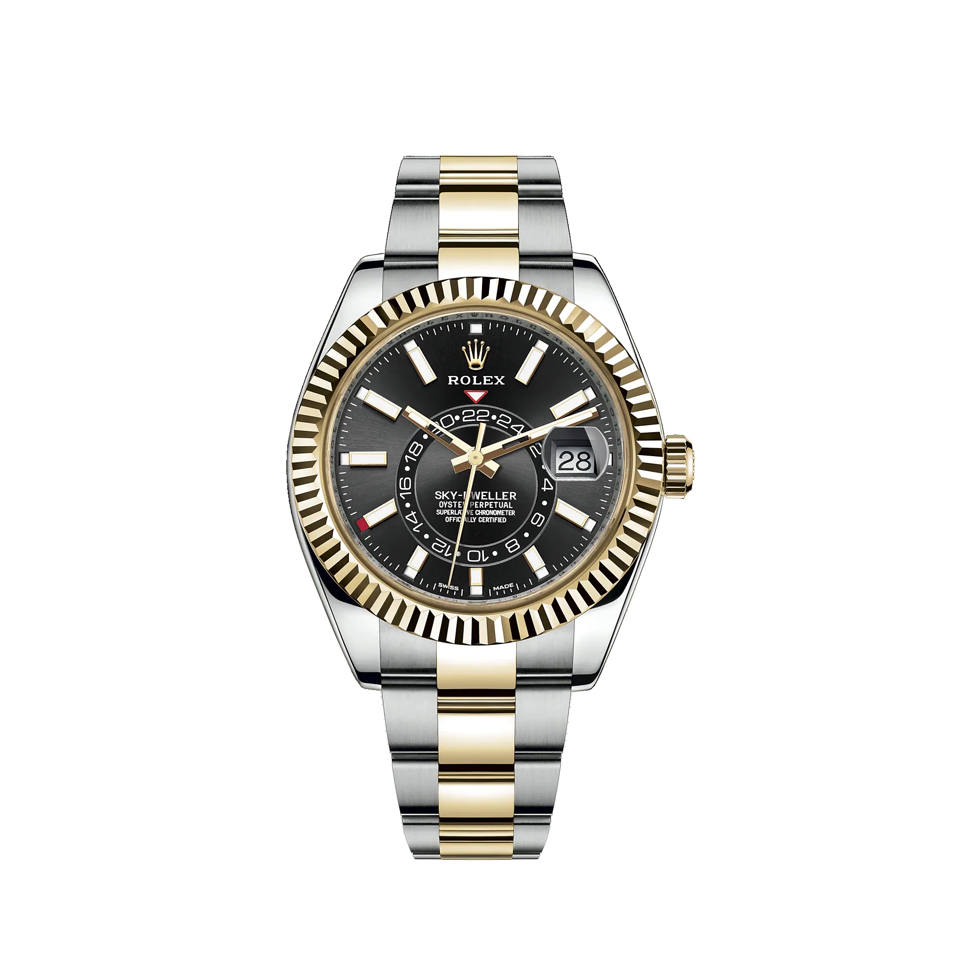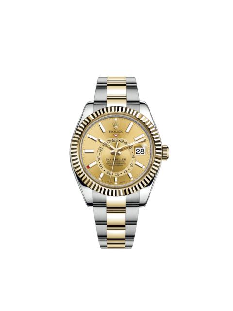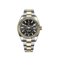 THE OYSTER PERPETUAL SKY-DWELLER IN OYSTERSTEEL AND YELLOW GOLD WITH A BRIGHT BLACK DIAL AND AN OYSTER BRACELET. This distinctive watch is characterized by its second time zone display on an off-centre disc on the dial. Furthermore, its innovative system for setting the functions, using the rotatable Ring Command bezel, is unique to Rolex. Model features Specifications Reference 326933