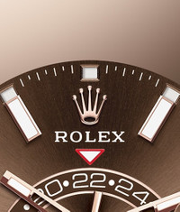 THE OYSTER PERPETUAL SKY-DWELLER IN 18 CT EVEROSE GOLD WITH A CHOCOLATE DIAL AND AN OYSTERFLEX BRACELET. This distinctive watch is characterized by its second time zone display on an off-centre disc on the dial. Furthermore, its innovative system for setting the functions, using the rotatable Ring Command bezel, is unique to Rolex. Model features Specifications Reference 326235