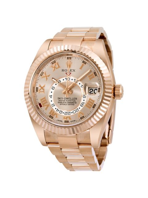 Pre-owned 18kt everrose gold case with a 18kt everrose gold rolex oyster bracelet. Fluted ring command 18kt everrose gold bezel. Dark rhodium dial with luminous everrose gold hands and index hour markers. Minute markers around the outer rim. Dial Type: Analog. Luminescent hands and markers. Date display at the 3 o'clock position. 24 hour subdials. Rolex Calibre 9001 automatic movement with a 72-hour power reserve. Scratch resistant sapphire crystal. Screw down crown. Solid case back. Round case shape. Case size: 42 mm. Oysterlock clasp. Water resistant at 100 meters / 330 feet. Functions: annual calendar, month, date, GMT, second time zone, hour, minute, second, chronometer. Luxury watch style. Watch label: Swiss Made. Rolex Sky-Dweller Dark Rhodium Automatic Men's 18kt Everrose Gold Oyster Watch 326935DRSO. GENERAL Preowned Item Condition: Excellent CASE Case Material: 18kt Everrose Gold Case Shape: Round Case Back: Solid BAND Band Material: 18kt Everrose Gold Rolex Oyster Band Type: Bracelet Clasp: Oysterlock DIAL Dial Color: Dark Rhodium Type: Analog Crystal: Scratch Resistant Sapphire Hands: Luminous Everrose Gold Dial Markers: Index Second Markers: Minute Markers around the outer rim Sub Dials: One - 24 Hour Luminiscence: Hands and Markers Bezel: Bi-directional Rotating Ring Command Bezel Material: 18kt Everrose Gold Crown: Screw Down INFORMATION Brand: Rolex Series: Sky-Dweller Collection Name: Sky Dweller Gender: Mens Model: 326935DRSO Watch Label: Swiss Made Movement: Automatic Engine: Rolex Calibre 9001 Power Reserve: 72 hours FEATURES Water Resistance: 100 meters / 330 feet Calendar: Date display at the 3 o'clock position Functions: Annual Calendar, Month, Date, GMT, Second Time Zone, Hour, Minute, Second, Chronometer Watch Features: Analog, GMT, Annual Calendar, Chronometer, Month, Gold, Time Zone ADDITIONAL INFO Watch Style: Luxury Warranty: 1 Year Jomashop Warranty UPC Code: 842047137956 Jomashop Sku: PRE-P-RLX100701 Department: Watches Category: Watches