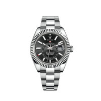 THE OYSTER PERPETUAL SKY-DWELLER IN OYSTERSTEEL AND WHITE GOLD WITH A BRIGHT BLACK DIAL AND AN OYSTER BRACELET. This distinctive watch is characterized by its second time zone display on an off-centre disc on the dial. Furthermore, its innovative system for setting the functions, using the rotatable Ring Command bezel, is unique to Rolex. Model features Specifications Reference 326934