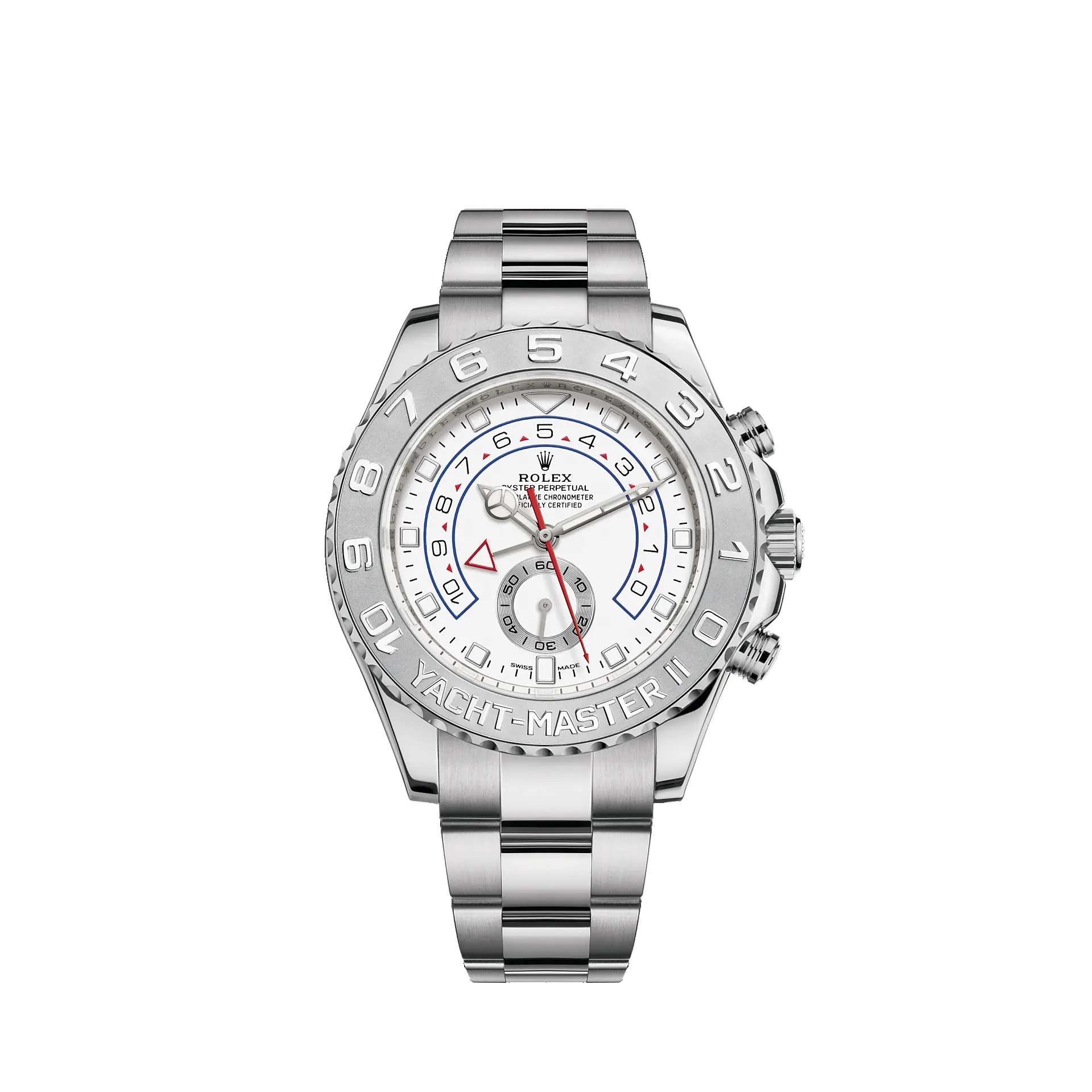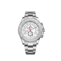 THE OYSTER PERPETUAL YACHT-MASTER II IN 18 CT WHITE GOLD AND PLATINUM WITH AN OYSTER BRACELET AND A BIDIRECTIONAL ROTATABLE RING COMMAND BEZEL IN SOLID PLATINUM. The only chronograph in the world with a mechanical memory, the Yacht-Master II with its bezel acting as a programmable countdown, is an essential tool for skippers to gauge their best course of action. Model features Specifications Reference 116689