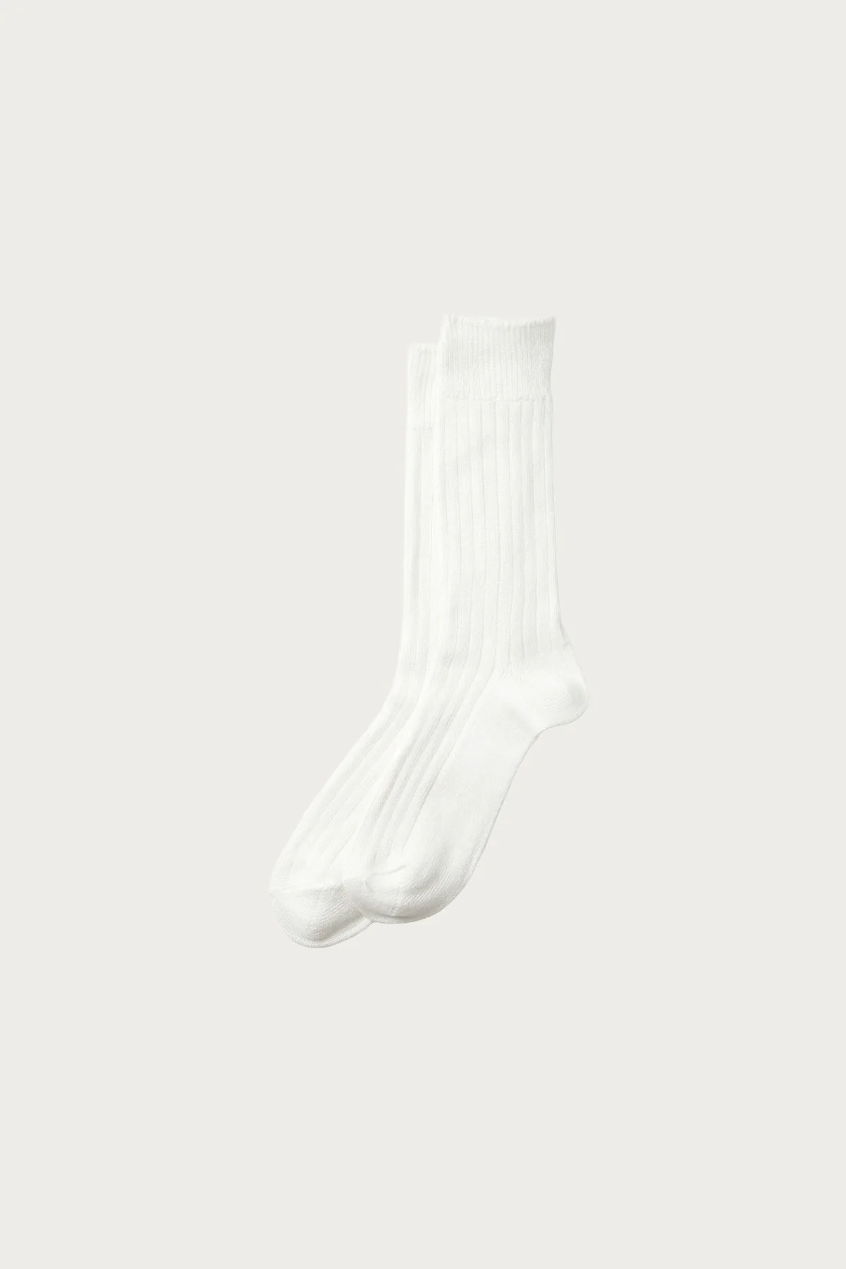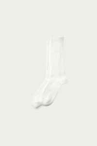 Lightweight and breathable, these socks are designed for warmer days and easy layering. The linen and cotton blend offers natural airflow with a soft hand, while the classic ribbed construction keeps the look grounded and versatile. An ideal choice when you want comfort without bulk. - Ribbed crew length - Linen and cotton blend - Lightweight and breathable - Made in Japan - Off-White