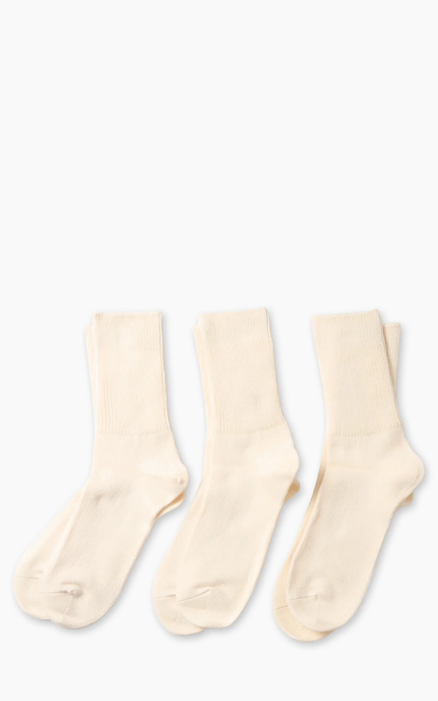 This pack includes 3 pairs of simply designed socks made of undyed organic cotton. The leg of each sock is 1x1 rib knitted for soft stretch, while the foot is jersey knitted for less stretch to avoid the item to be crumpled in leather shoes. - Style: R1427 - Color: Ivory - Material: 93% cotton, 5% nylon, 2% polyurethane - 3-pack - Extra soft hand feel - Recommend a low heat wash - Made in Japan Sizing: M: 7-9 (25-27 CM) L: 9-11 (27-29CM)
