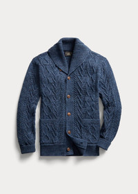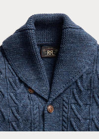 Aran-knit from cotton slub yarn for added texture. Racking stitch details at the collar and placket. Ribbed cuffs and hem. Genuine horn buttons. DETAILS - Size medium has a 26" body length (front and back), a 17" shoulder, a 40" chest, and a 24½" sleeve length. Sleeve length changes ½" between sizes. - Shawl collar with a two-button closure at the right side. Five-button placket. Genuine horn buttons. - Long sleeves with rib-knit cuffs. - Two front waist patch pockets. - Rib-knit hem. - 100% cotton. - Machine washable. - Imported. Style Number: 607542