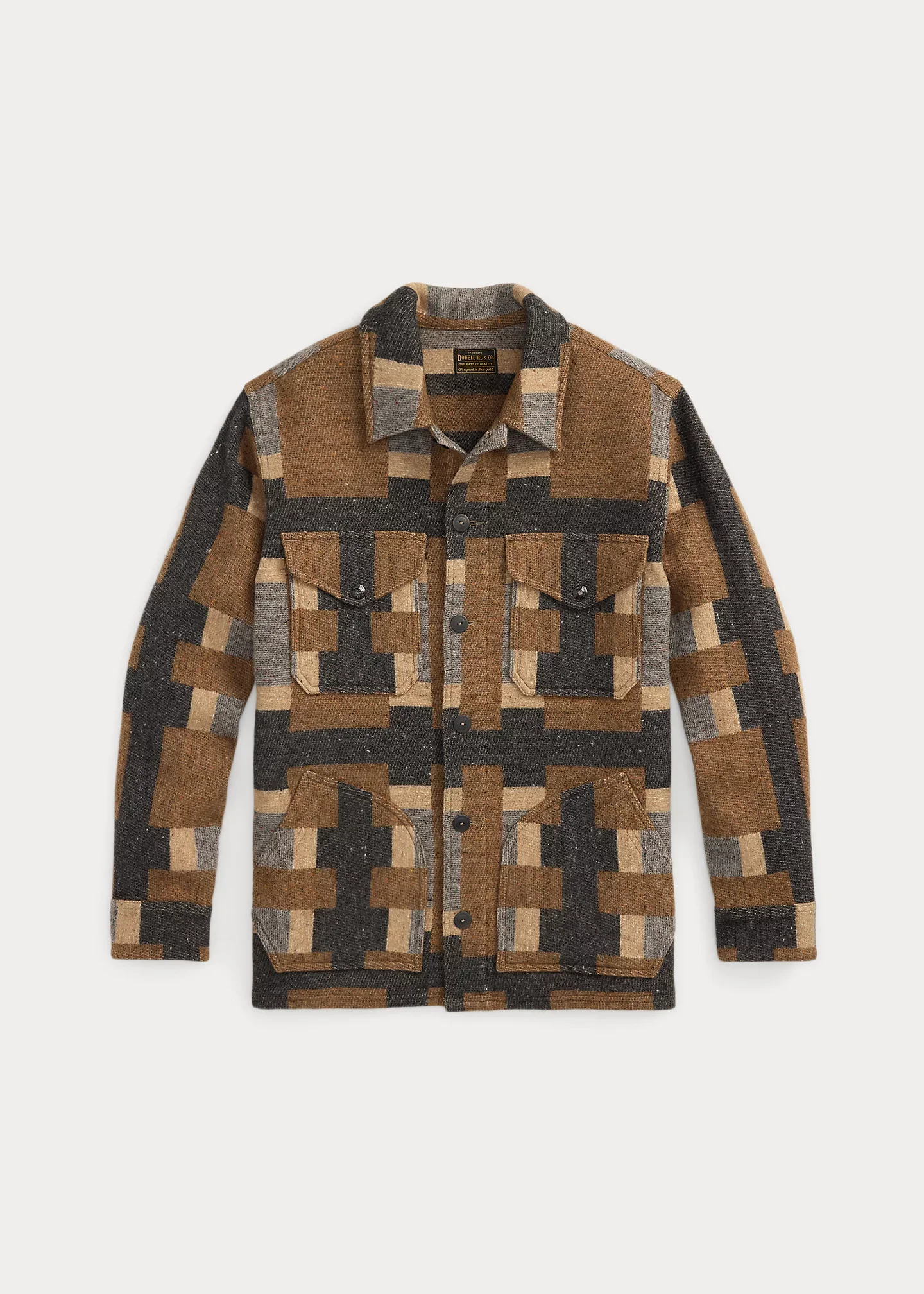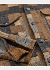 Made with wool-blend jacquard from Italy. Pattern, yarn texture, and color palette are inspired by a vintage blanket. Model is based on cruiser motorcycle jackets. Unlined. Chamois lining at the hand-warmer pockets. Corozo buttons. Enameled custom snaps at the chest pockets. DETAILS - Size medium has a 30.25" front body length, an 18.5" shoulder, a 45.5" chest, and a 34.5" sleeve length. Sleeve length is taken from the center back of the neck. - Straight collar. Buttoned placket. Corozo buttons. - Long sleeves with buttoned cuffs. Chamois facing at the cuffs. - Two chest snapped pockets. Chamois facing at the pocket flaps. Two hand-warmer pockets with chamois lining. - Unlined. - 64% wool, 18% cotton, 18% nylon. - Dry clean. - Imported. - Style Number: 100064285