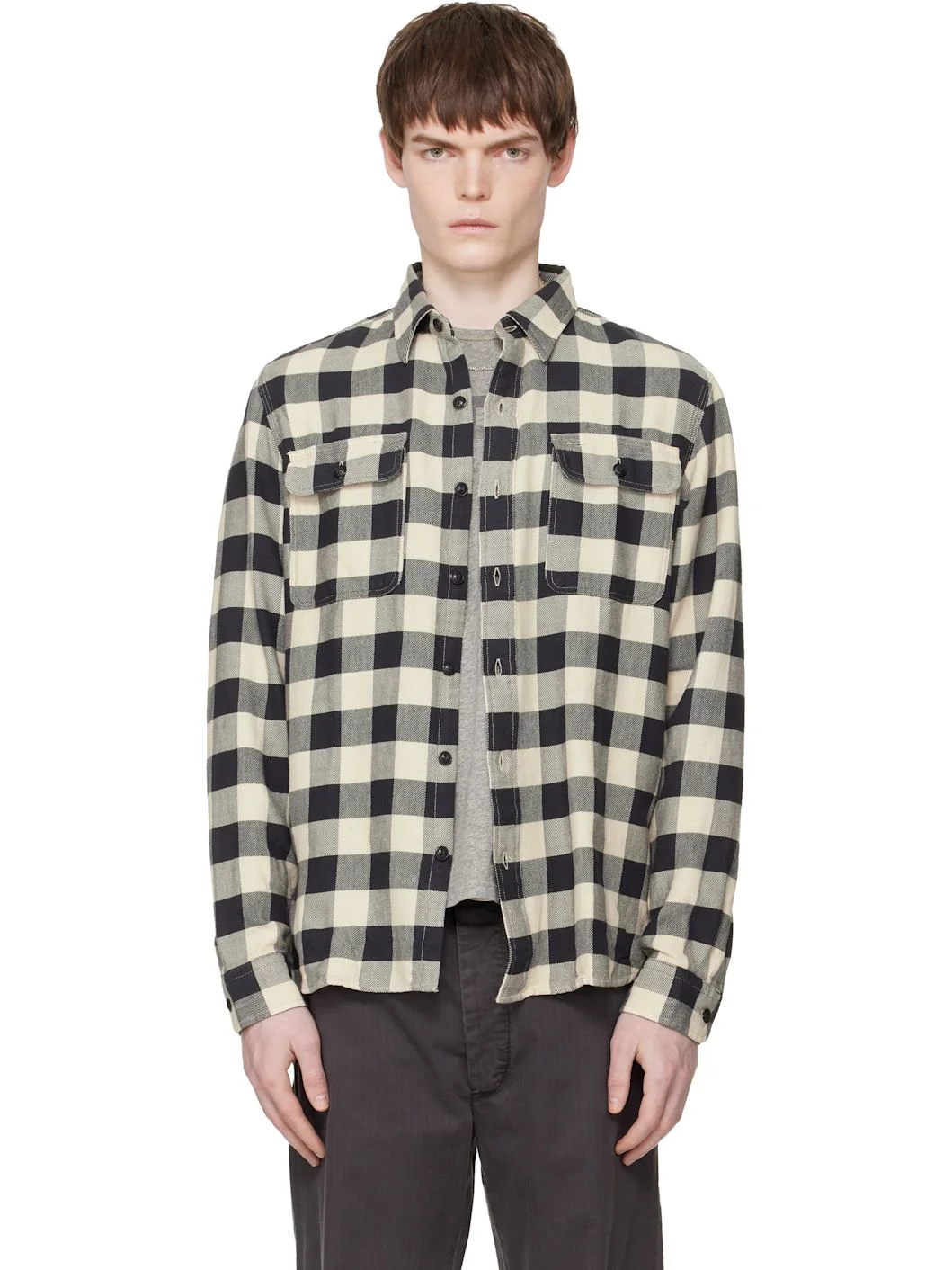 Cotton- and linen-blend flannel shirt. · Check pattern throughout · Spread collar · Button closure · Flap pockets at chest · Shirttail hem · Buttoned barrel cuffs Supplier color: Black/Cream 90% cotton, 10% linen. Made in India 261435M192012