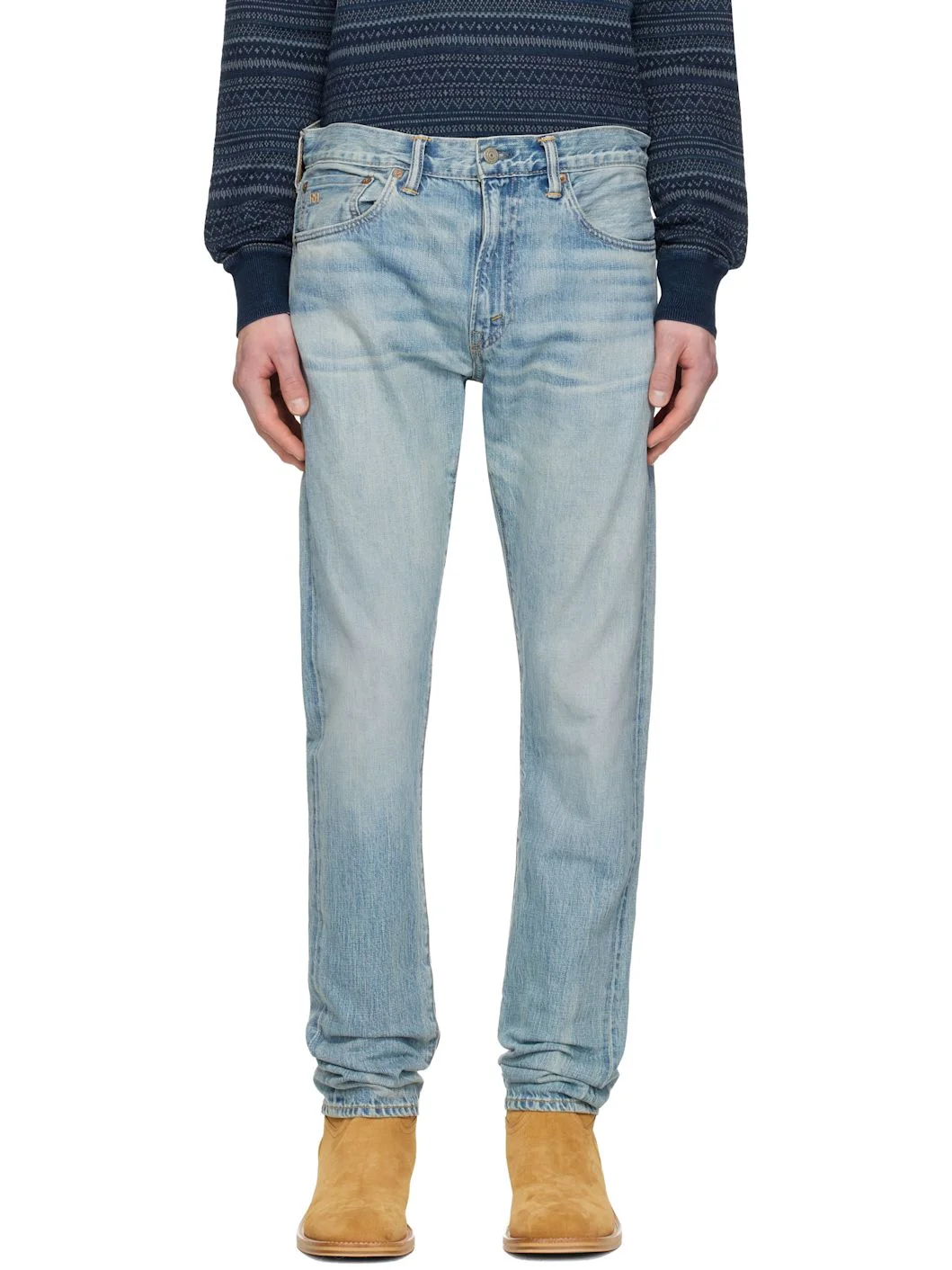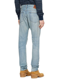Indigo-dyed non-stretch denim jeans. · 11.3 oz selvedge denim, Sanforized® · Fading and whiskering throughout · Tapered leg · Belt loops · Five-pocket styling · Zip fly · Embroidered logo at coin pocket · Leather logo patch at back waist · Logo-engraved brass-tone hardware · Contrast stitching in tan Supplier color: Lawton Wash 100% cotton. Made in United States 252435M186014