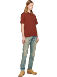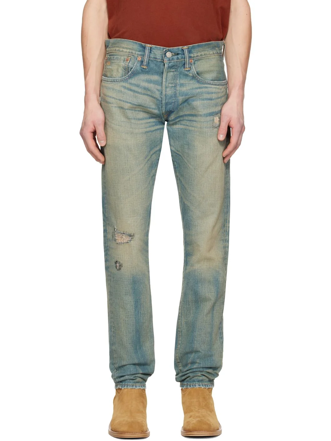 Non-stretch Ridgway Twill denim jeans. · Shuttle-woven left-hand twill, 13.7 oz selvedge · Fading, whiskering, and distressing throughout · Tapered leg · Mid-rise · Belt loops · Five-pocket styling · Button fly · Embroidered logo at coin pocket · Stitching at front legs · Leather logo patch at back waist · Logo-engraved gold-tone and silver-tone hardware · Contrast stitching in tan Supplier color: Ridgway Wash 100% cotton. Made in United States 252435M186002