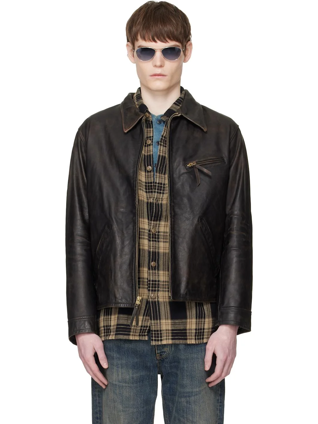 Creased leather jacket. · Fading throughout · Spread collar · Zip closure · Zip pocket at chest · Welt pockets at waist · Button hardware at cuffs · Cinch tab at back waist · Welt pocket at interior · Flannel lining Supplier color: Black Over Brown Body: 100% leather. Lining: 100% cotton. Pocket lining: 51% cupro, 49% cotton. Made in India 261435M181003