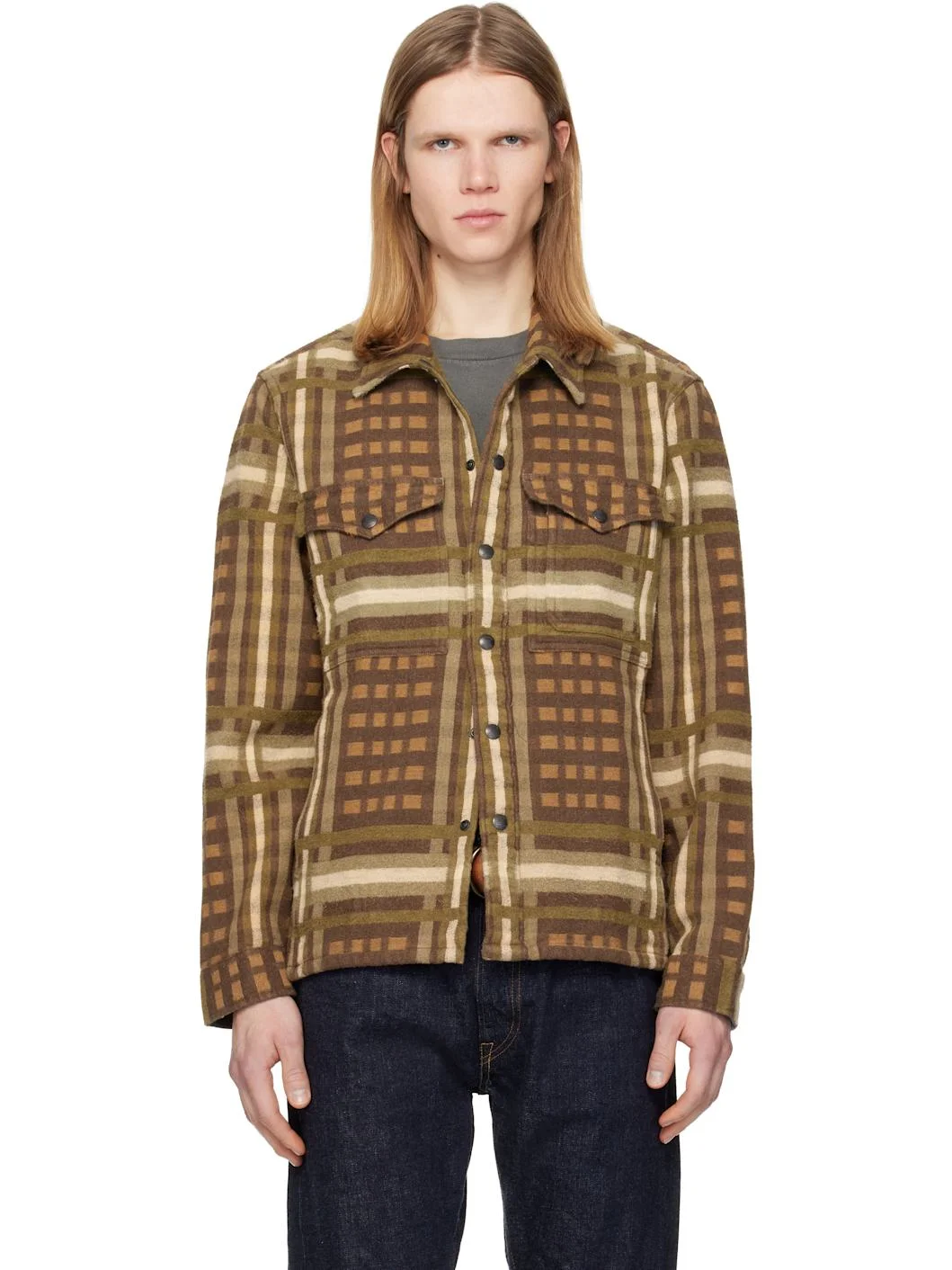 Brushed cotton flannel overshirt. · Check pattern throughout · Spread collar · Press-stud closure · Flap pockets at chest · Seam pockets at waist · Barrel cuffs · Logo-engraved gunmetal-tone hardware Supplier color: Brown Multi 100% cotton. Made in India 252435M192012