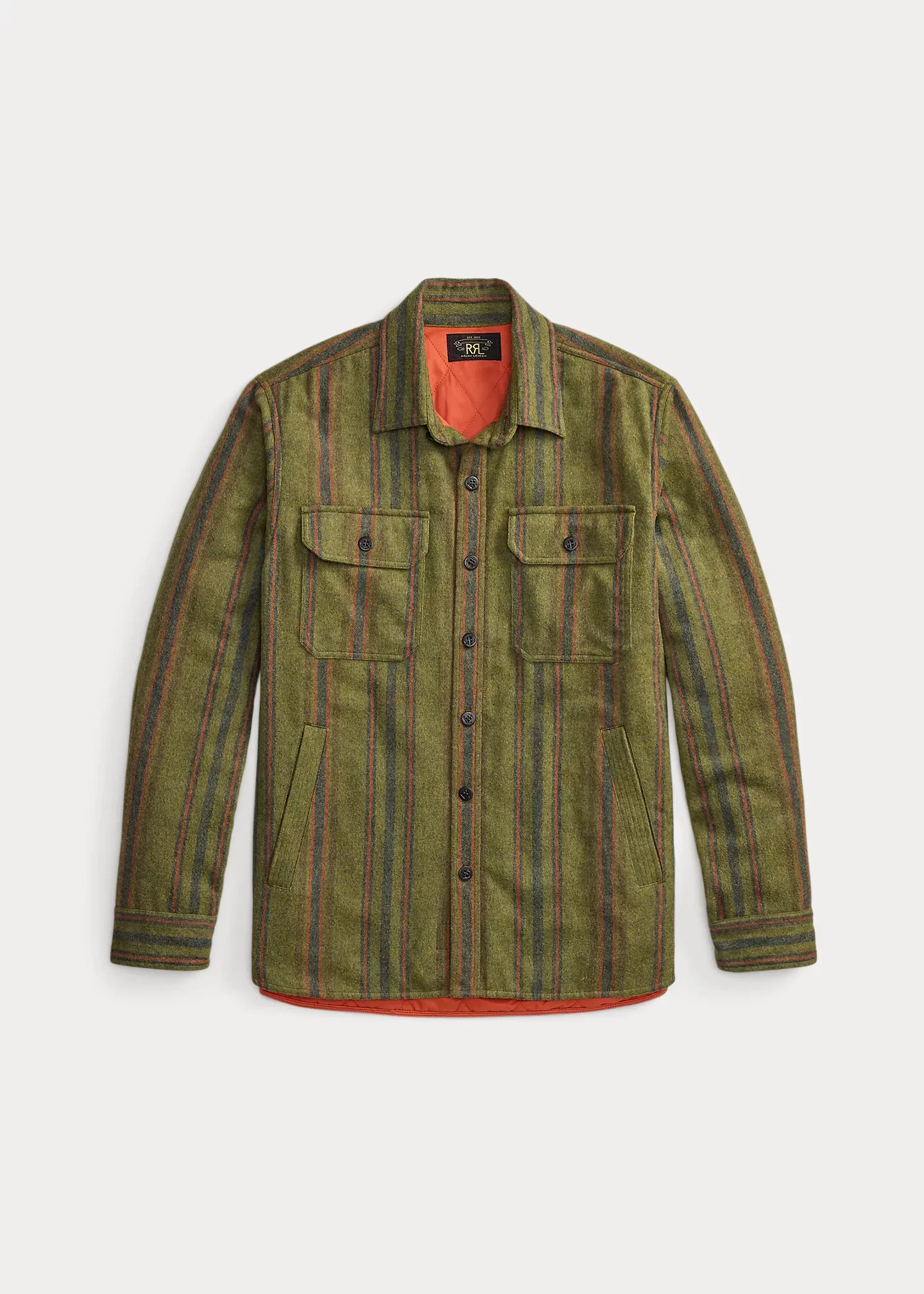 Utilitarian-inspired shirt jacket model. Fiber-dyed striped twill is woven with a blend that includes wool and cotton. Brushed texture. Contrasting diamond-quilted ripstop interior. Insulated with a lightweight down-alternative fill. Hand-warmer pockets. Anchor-detailed buttons. DETAILS - Size medium has a 29.25" front body length, an 18.5" shoulder, a 45.25" chest, and a 34.75" sleeve length. Sleeve length is taken from the center back of the neck. - Straight collar. Buttoned placket. Anchor-detailed buttons. - Long sleeves with buttoned barrel cuffs. - Two chest buttoned pockets. Two hand-warmer pockets. - Fully lined and filled. Diamond-quilted ripstop interior. - Shell: 40% cotton, 40% wool, 20% nylon. Lining: 100% nylon. Fill: 100% polyester. - Hand wash or dry clean. - Imported. - Style Number: 100083745