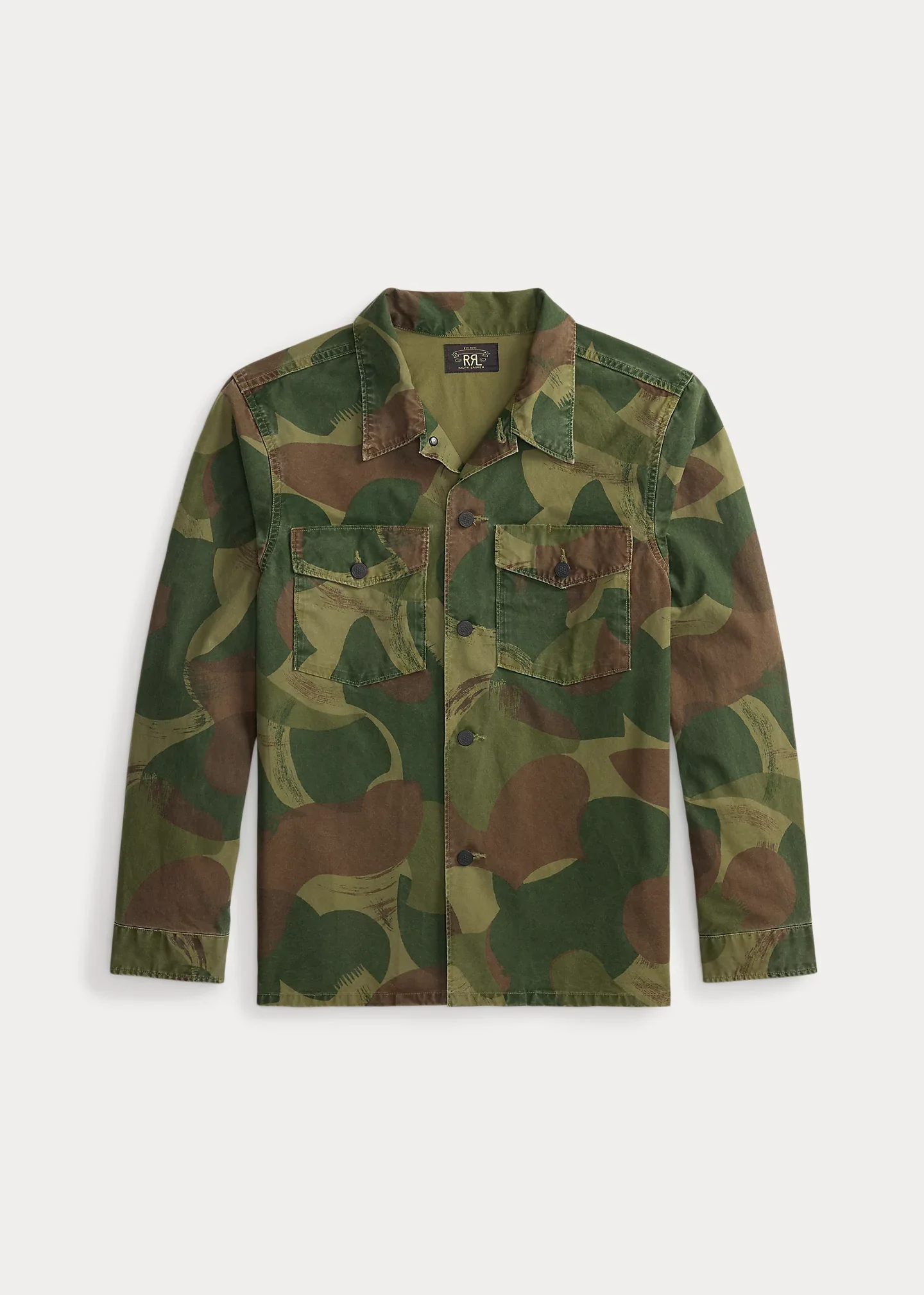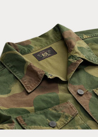 Boxy-fitting overshirt made with cotton poplin. Printed with a 1950s-inspired camo motif. Detailing based on surplus garments from the ’60s. Specially treated for a muted effect with a vintage, worn-in look. DETAILS - Boxy fit. Size medium has a 27.5" back body length, a 19" shoulder, a 45" chest, and a 34.75" sleeve length. Sleeve length changes 1" between sizes. - Straight collar. Buttoned placket. Metal buttons. - Long sleeves with buttoned barrel cuffs. - Two chest buttoned pockets. - Straight hem. - 100% cotton. - Machine washable. - Imported. - Style Number: 100080569