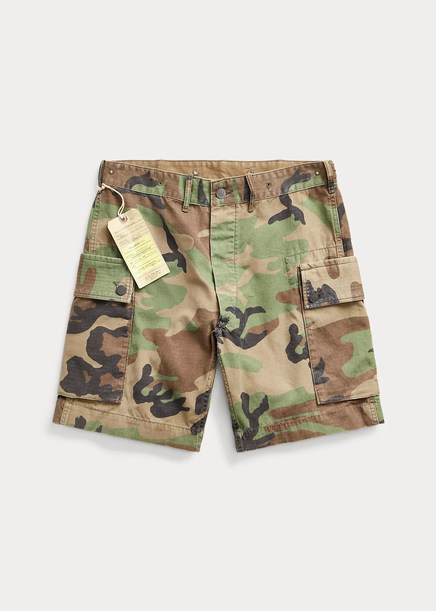Cut from 6.1 oz camouflage cotton ripstop. Double-entry cargo pockets. Stone-washed. DETAILS - Regular fit with a standard rise. - All sizes have an 8¼" inseam. Size 32W has a 10" rise. - Belt loops. Side adjusters. Embroidered eyelets at the waistband. Button fly with a buttoned closure. - Double-entry cargo pockets at the thighs. Two back buttoned pockets. - Reinforced stitching at the seat. - 100% cotton. - Machine washable. - Imported. Style Number: 607596