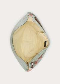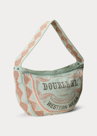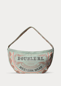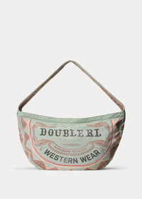 Made with 9.44 oz. cotton canvas. Inspired by vintage newsboy mailbags from the 1950s. Half-moon shape. Logo graphic and allover print are hand-sanded for a distressed look. Padded shoulder strap. Unlined. Custom brass zipper. Distressed copper-tone rivets with leather washers. Heavily laundered and lightly tinted. DETAILS - Padded canvas shoulder strap with an approx. 11.5" drop. - Top zip closure with a leather zipper pull. - “Double RL & Company Superior Quality Western Wear” graphic printed at the front and the back. - Interior slip pocket. - Distressed copper-tone rivets with leather washers. - Unlined. - 13.25" H at the center. 26" L x 3" D at the top. - Shell: 100% cotton. Decoration: 100% leather. - Spot clean with a soft, dry cloth. Imported. - Style Number: 100080214