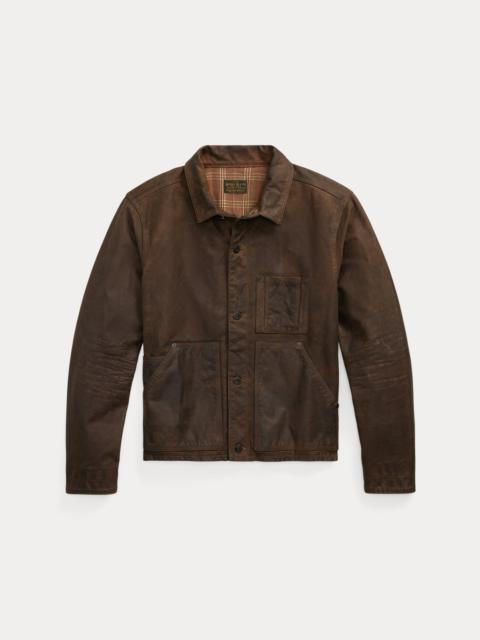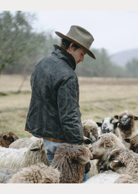 Made with cotton oilcloth that is printed with a subtle pattern. Vintage sporting–inspired model. Corduroy collar and cuff facings. Leather triangular reinforcements and trim. Brushed chamois lining at the body and pockets. Corozo buttons. DETAILS - Size medium has a 29.75" front body length, a 29" back body length, a 19" shoulder, a 47.5" chest, and a 35" sleeve length. Sleeve length is taken from the center back of the neck. - Corduroy shawl collar. Buttoned placket. Corozo buttons. - Long sleeves. Adjustable buttoned tabs at the cuffs. Corduroy facing at the cuffs. - Two hand-warmer pockets. Two front waist flapped pockets. Two interior chest pockets. Leather triangular reinforcements and trim at the hand-warmer pockets and interior pockets. Brushed chamois pocket lining. - Fully lined. Body is lined with brushed chamois. - Shell, collar, facing, and body lining: 100% cotton. Sleeve lining: 100% viscose. - Machine washable. - Imported. - Due to the wax finish, color will fade over time with use and may rub off onto fabrics and upholstery. - Style Number: 100066007