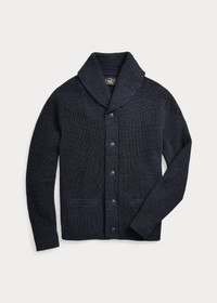 Made with combed cotton yarns. Inspired by surplus sweaters from the 1940s. Knit using a half-cardigan stitch with racking details at the collar and placket. Ribbed cuffs and hem. Corozo buttons. DETAILS - Size medium has a 26" body length, a 17" shoulder, a 40" chest, and a 25" sleeve length. - Shawl collar with a two-button closure at the right side. Buttoned placket. Corozo buttons. - Long sleeves with rib-knit cuffs. - Two front waist welt pockets. - Rib-knit hem. - 100% cotton. - Machine washable. - Imported. - Style Number: 100028641