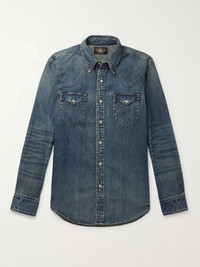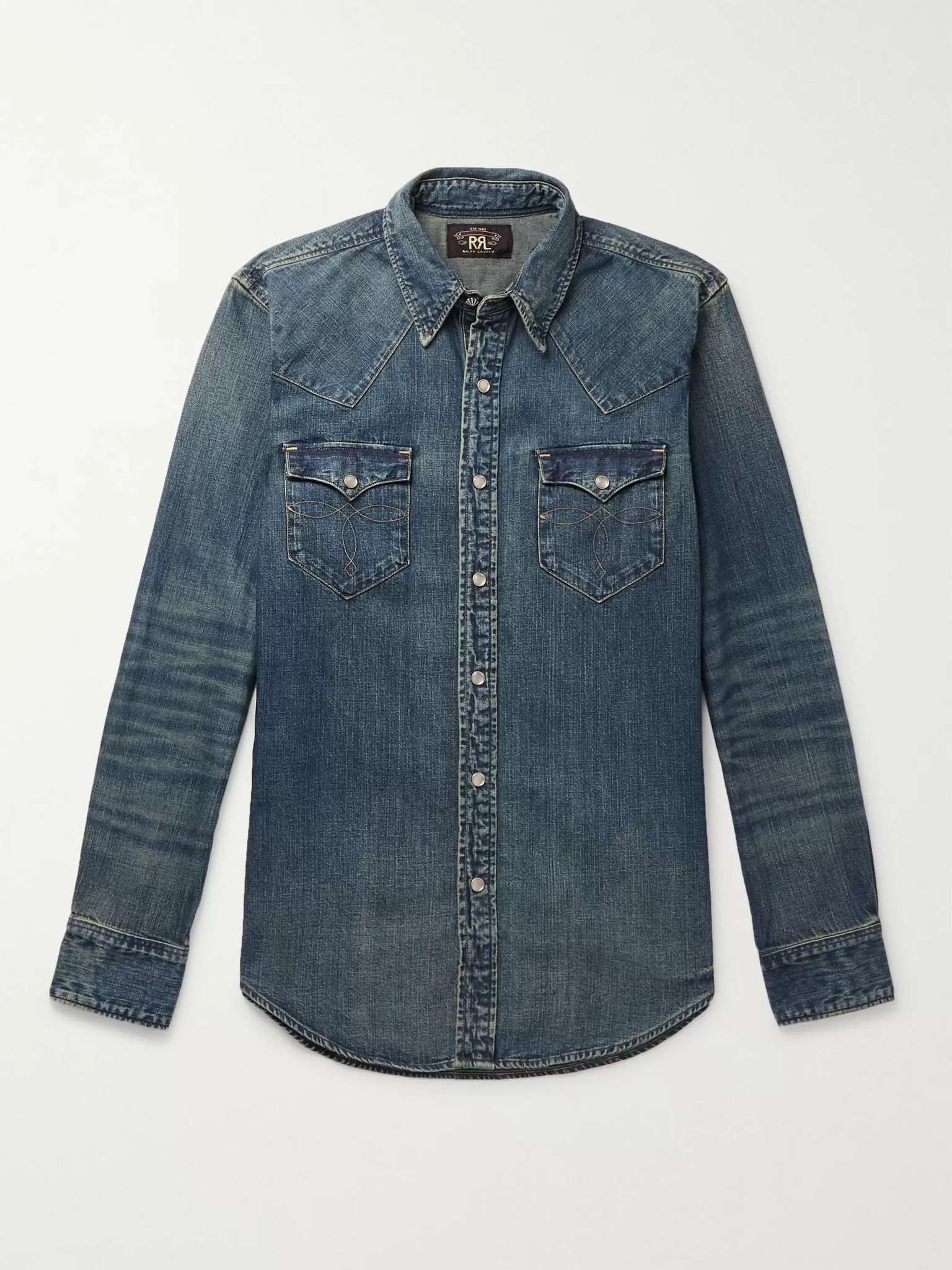 RRL's shirt is reminiscent of the styles traditionally worn in the American Midwest. Made from blue denim that's washed for a lived-in feel, this one is cut in a slim fit and detailed with an angular yoke and embroidered flap pockets. Shown here with: RRL Trousers, rag & bone T-shirt, Yuketen Boots. Size & Fit - Fits true to size. Take your normal size - This shirt is designed for a slim fit - Those with broad shoulders may wish to take the next size up - Model wears a M - Model measures: chest 38"/ 96cm, height 6'1"/ 185cm Details & Care - Blue denim - Classic collar, snap-fastening cuffs and chest flap pockets, gold embroidery - Snap fastenings - 100% cotton - Machine wash