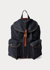 Unisex. Constructed from the same raw American denim as Double RL jeans. Trimmed with Italian vegetable-tanned bridle leather. Solid brass hardware and copper rivets. DETAILS - Leather top handle. - Two adjustable leather shoulder straps with brass buckles. - Front fold-over leather flap secures with a brass buckle. - Drawstring closure underneath the front fold-over flap. - Two snapped flap pockets at the front. Roughout leather base. - Unlined. Zip pocket at the interior. Includes a dust bag. - 16" H x 25" L x 6" D. - Body: cotton. Trim: leather. - Dry clean by a leather specialist. Imported. Style Number: 394725