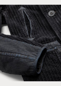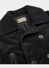 Based on a coat from the late 19th century. Made with cotton corduroy of variegated wale widths. Detailed with coated indigo denim from Japan. Brushed houndstooth twill lining at the body. Brushed chamois pocket bags. Anchor-engraved corozo buttons. DETAILS - Size medium has a 29.25" front body length, a 28.5" back body length, an 18" shoulder, a 44.5" chest, and a 35" sleeve length. Sleeve length is taken from the center back of the neck. - Notch lapels. Buttoned throat latch. Double-breasted silhouette. Anchor-engraved corozo buttons. - Long sleeves with denim forearm patches. Denim trim at the cuffs. - Two hand-warmer pockets with denim triangular reinforcements. Two front waist patch pockets with denim trim. Interior left chest pocket. Interior right waist pocket. - Single vent. - Fully lined. Body is lined with brushed houndstooth twill. - Shell, trim, and body lining: 100% cotton. Sleeve lining: 100% viscose. - Machine washable. - Imported. - Style Number: 100056704