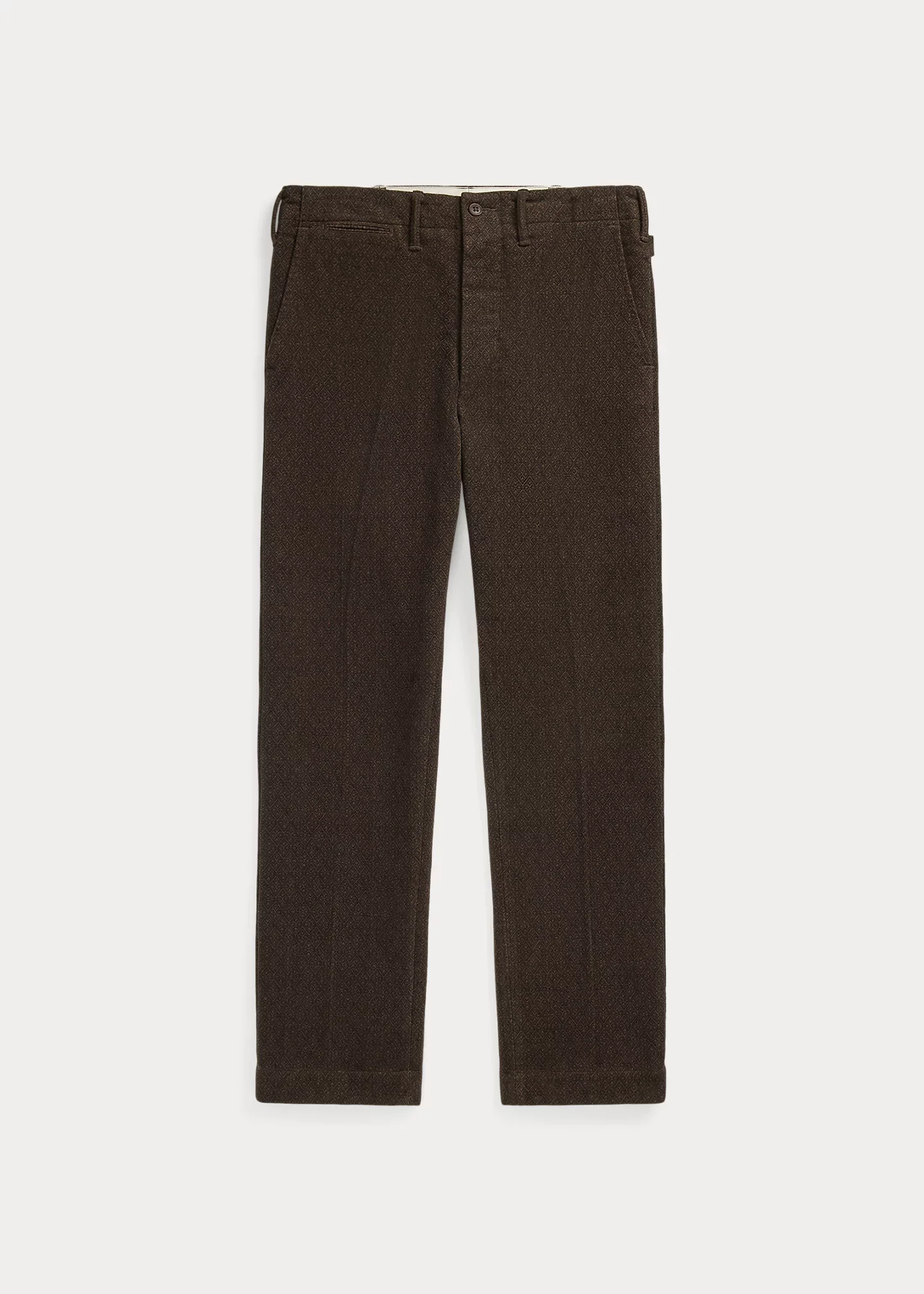 Trim-fitting pants with a straight leg. Made with stretch cotton moleskin from Italy. Printed with an Art Deco–inspired diamond motif. Side adjusters. Corozo buttons. DETAILS - Trim fit with a straight leg and standard rise. - Size 32W has a 12.25" rise and a 17" leg opening. - Belt loops. Side adjusters. Button fly with a buttoned closure. Corozo buttons. - Two front angled pockets. Right hip coin pocket. Two back buttoned pockets. - 98% cotton, 2% elastane. - Machine washable. - Imported. - Model is 6'1" (185 cm) and wears a size 32W x 32L. - Style Number: 100064838