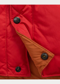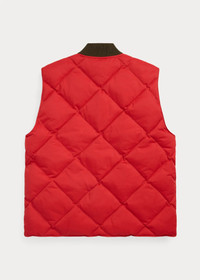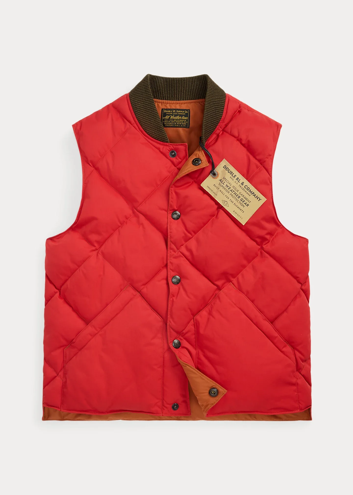 Diamond-quilted vest made with pigment-coated nylon twill. Ribbed cotton-and-wool baseball collar. Insulated with a down-alternative fill. Brushed chamois lining at the hand-warmer pockets. Signature snaps with an antiqued-brass finish. DETAILS - Size medium has a 25.5" body length (front and back), a 16.5" shoulder, and a 45" chest. - Ribbed baseball collar. Snapped placket. Metal snaps custom-developed with a “Double RL Ralph Lauren Manhattan N.Y.” logo. - Two hand-warmer pockets with chamois lining. Interior right chest pocket. - Fully lined and filled. - Shell: 100% nylon. Ribbed collar: 51% cotton, 49% wool. Lining and fill: 100% polyester. - Machine washable. - Imported. - Style Number: 100062921