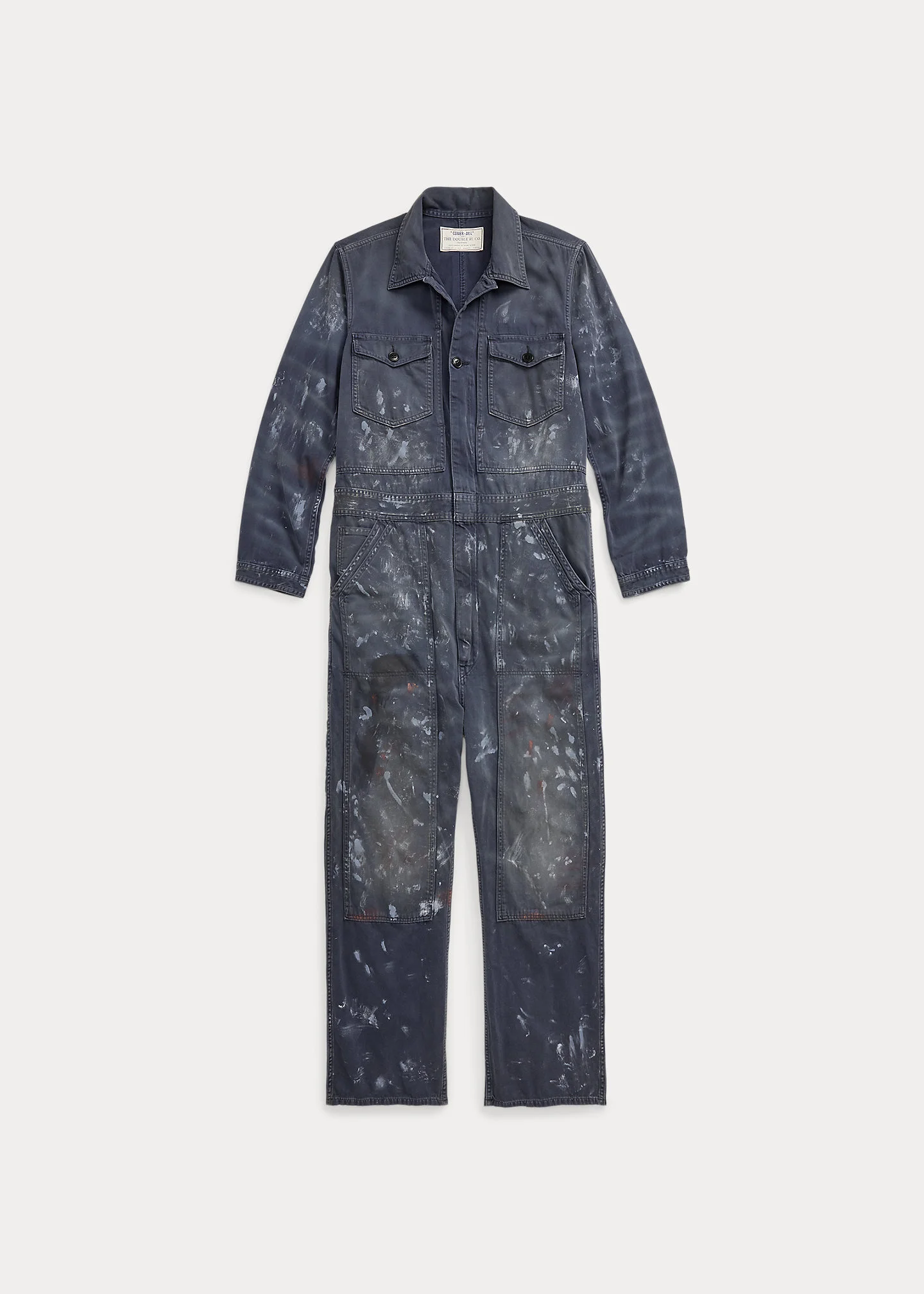 Classic-fitting coverall made from 6.2 oz. Japanese sateen with the reverse side facing out. Vintage workwear–inspired details. Concealed zip front with a buttoned closure. Garment-dyed. Distressed with paint splatters. Corozo buttons. DETAILS - Classic fit with a straight leg. - Size medium has an 18" shoulder, a 44.5" chest, a 34.75" sleeve length, a 29.75” inseam, and a 19.25” leg opening. Sleeve length is taken from the center back of the neck. - Straight collar. Concealed zip front with a buttoned closure. Buttoned side adjusters. Corozo buttons. - Long sleeves with buttoned barrel cuffs. - Two chest buttoned pockets with an additional side-entry. Two front waist angled pockets with overlapping pockets. Reinforced paneling at the legs. Right hip coin pocket. Two back patch pockets. Right leg tool pocket. - 100% cotton. - Machine washable. - Imported. - Coloring may rub off onto fabrics and upholstery. - Style Number: 100056576