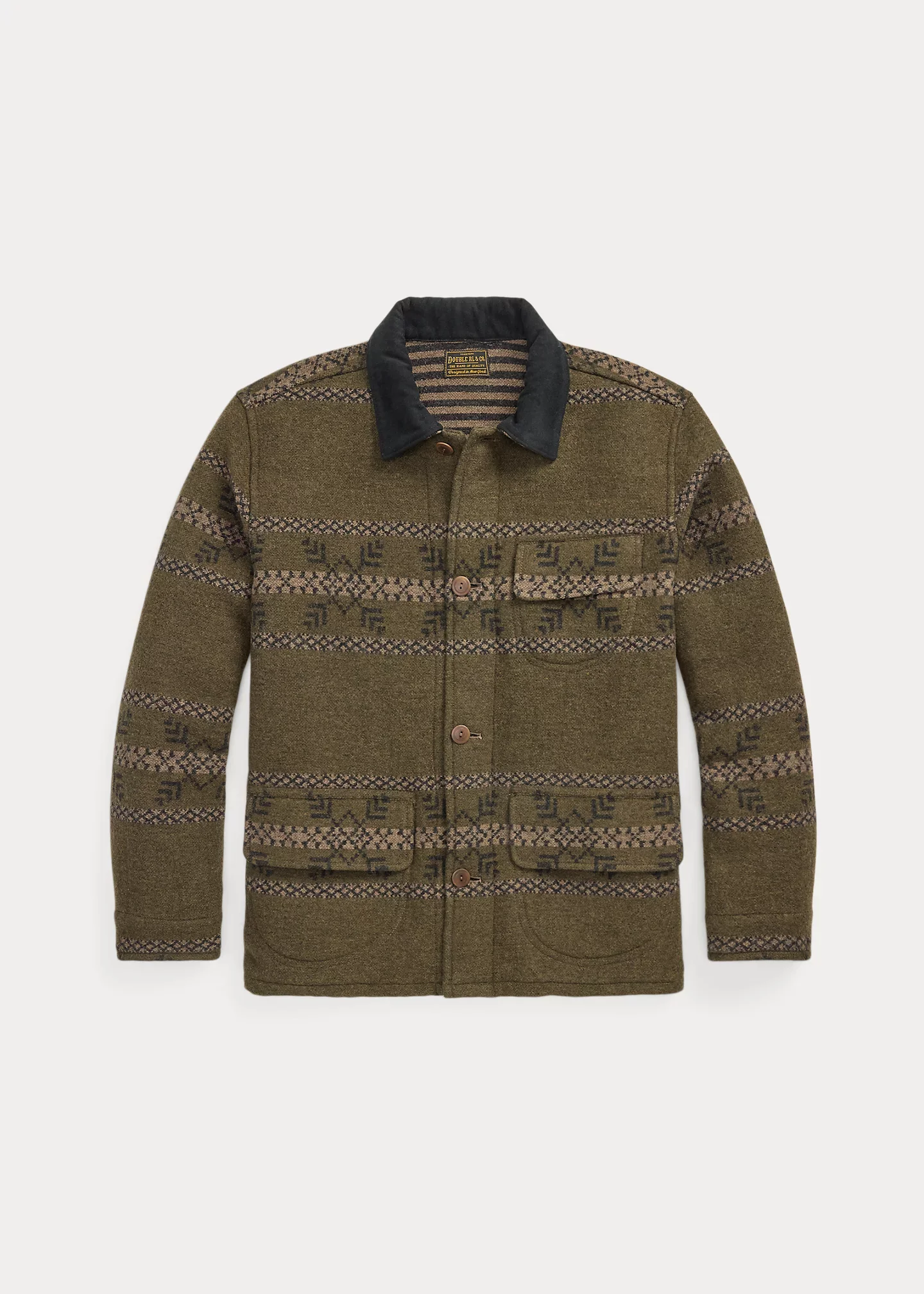 Made with double-faced wool-blend jacquard from Italy. Vintage sporting–inspired model. Patterned olive melange fabric with a striped motif at the interior. Brushed finish. Moleskin collar. Lined at the sleeves. Corozo buttons. DETAILS - Size medium has a 28.25" front body length, a 27.75" back body length, a 19" shoulder, a 45" chest, and a 35" sleeve length. Sleeve length is taken from the center back of the neck. - Moleskin straight collar. Buttoned placket. Corozo buttons. - Long sleeves with buttoned barrel cuffs. - Left chest flapped pocket. Two front waist flapped pockets. - Straight hem. Double vent. Lined at the sleeves. - Shell and undercollar: 67% wool, 17% nylon, 14% cotton, 2% other fibers. Sleeve lining: 100% viscose. - Hand wash or dry clean. - Imported. - Due to the natural characteristics of this material, the coloring may rub off onto fabrics and upholstery. - Style Number: 100059629