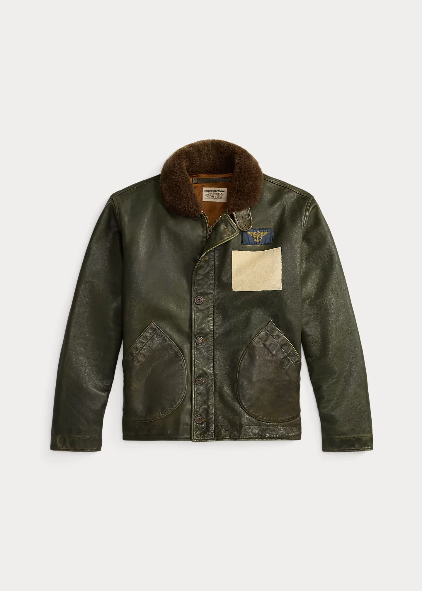 Based on a vintage nautical deck jacket. Full-grain cowhide with an olive hue. Shearling collar. Winged-anchor woven label with the Double RL logo and hand-painted blank white stencil box at the left chest. Lined with satin. Custom brass zipper. DETAILS - Size medium has a 28.75" front body length, a 26" back body length, a 20.25" shoulder, a 48" chest, and a 34.5" sleeve length. Sleeve length is taken from the center back of the neck. - Shearling shawl collar. Buttoned throat latch. Full-zip front. Brass zipper custom-developed with a “RRL” logo. Leather zipper pull. Buttoned storm placket. - Long sleeves. Ventilating metal grommets at the underarms. - Woven label with a winged anchor and “RRL” star at the left chest. - Two front waist patch pockets. Interior left waist pocket. - Interior drawstring hem. Fully lined with satin. - Shell and undercollar: 100% leather. Top collar: 100% dyed lamb shearling. Lining: 51% cotton, 49% viscose. - Spot clean. Imported. - Due to the natural characteristics of this material, the coloring may rub off onto fabrics and upholstery. - Style Number: 100086917