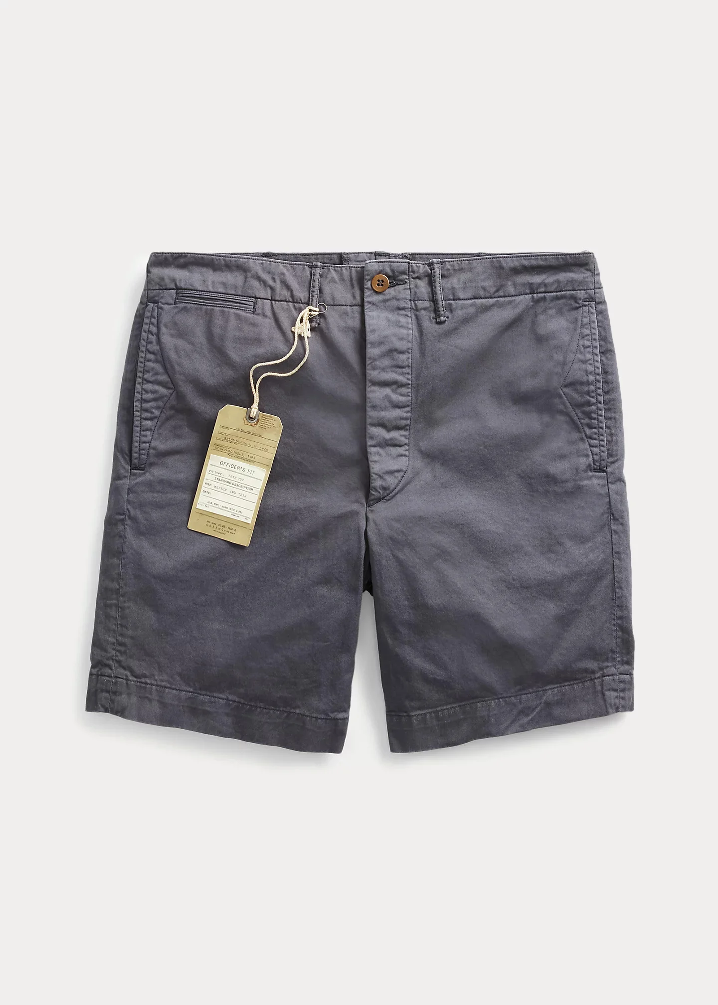 Based on Double RL chino pants. Made from 6.7 oz. cotton twill and garment-dyed. Hand-sanded for a distressed finish. Decorative stitching at the side on-seam pockets. Corozo buttons. DETAILS - Trim straight silhouette. - All sizes have an 8½" inseam. Size 32W has an 12¼" rise. - Belt loops. Button fly with a buttoned closure. Corozo buttons. - Side on-seam pockets. Right hip coin pocket. Two back buttoned pockets. - 100% cotton. - Machine washable. - Imported. Style Number: 516792