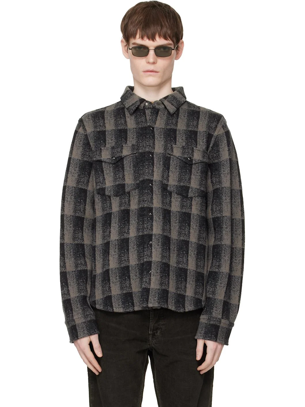 Knit wool- and cashmere-blend overshirt. · Check pattern throughout · Spread collar · Press-stud closure · Flap pockets at chest · Seam pockets at waist · Shirttail hem · Press-stud barrel cuffs · Western yoke at back Supplier color: Black multi Body: 99% wool, 1% cashmere. Lining: 51% cupro, 49% cotton. Made in Cambodia 261435M192000