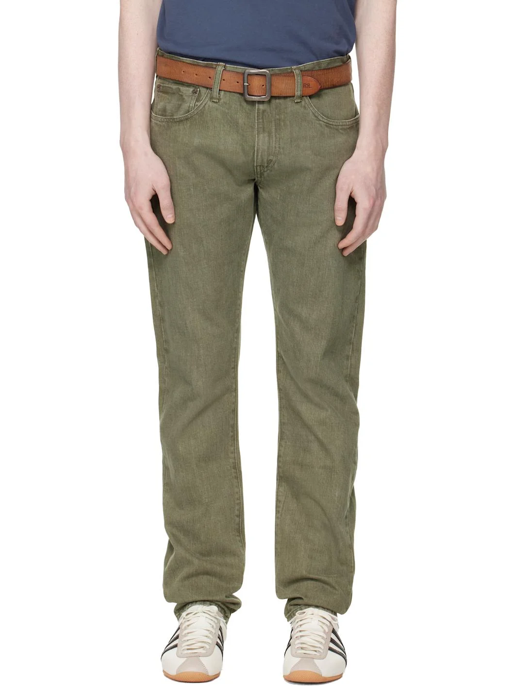 Sanforized 13.6 oz non-stretch denim jeans. · Fading throughout · Slim-fit · Low-rise · Belt loops · Five-pocket styling · Zip fly · Logo embroidered at coin pocket · Logo patch at back waistband · Logo-engraved antiqued copper-tone hardware Supplier color: Olive 100% cotton. Made in Tunisia 261435M186004