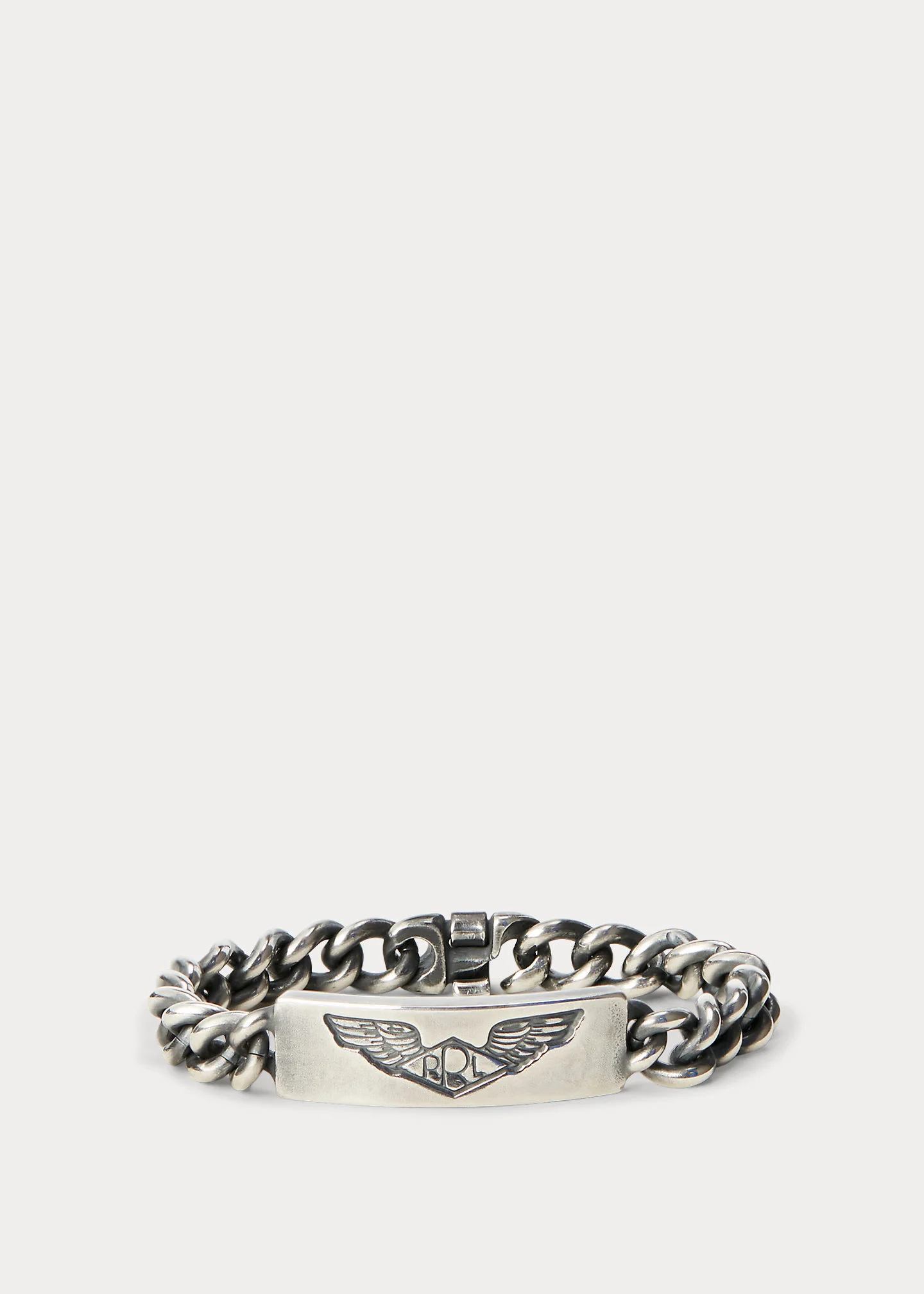 Solid .925 sterling silver is forged and finished entirely by hand in America. Each piece will slowly develop a unique patina with age and wear. Curb-link chain. Winged-“RRL” logo engraved at the plaque. Custom-designed clasp. DETAILS - 0.5" wide. - Winged-"RRL" logo engraved at the plaque. - Custom fold-over clasp. - Size S has a 7.5" length. - Size L has a 9.25" length. - Sterling silver. - Made in USA. - Comes with a signature box and a storage bag. Style Number: 577156