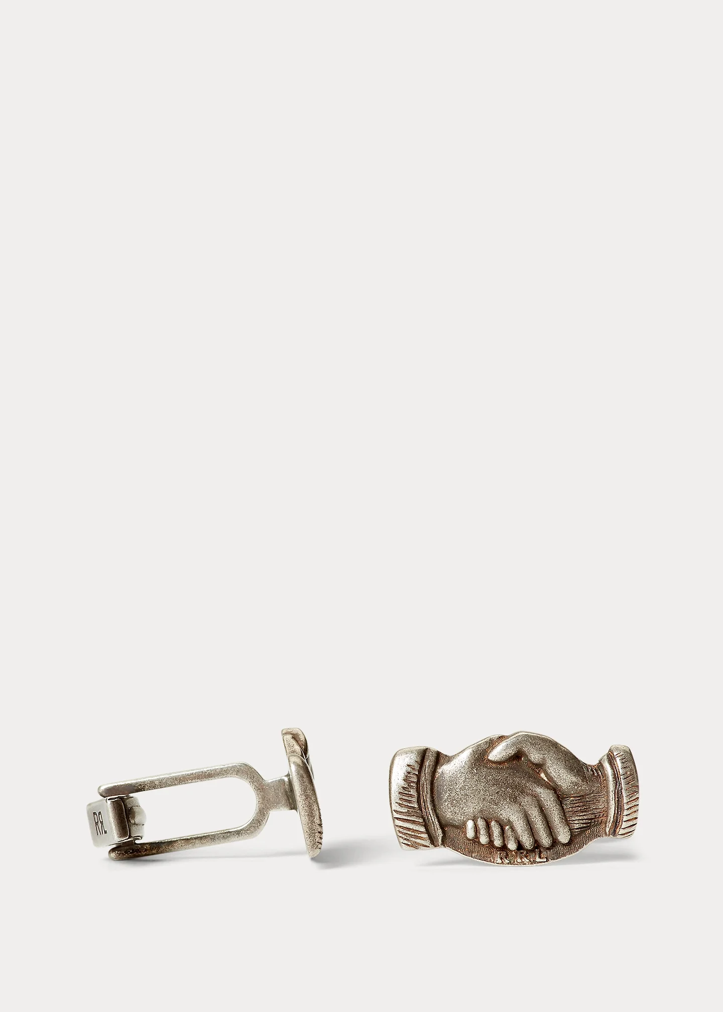 Silver-plated cuff links. Handshake motif and “R.R.L” engraved at the front. Comes in a signature box and with a dust bag. DETAILS - Set of two cuff links. - T-back fastening. - ¾" wide. - Handshake motif and "R.R.L" engraved at the front. - Silver-plated metal. - Imported. - Comes in a signature box and with a dust bag. Style Number: 538888