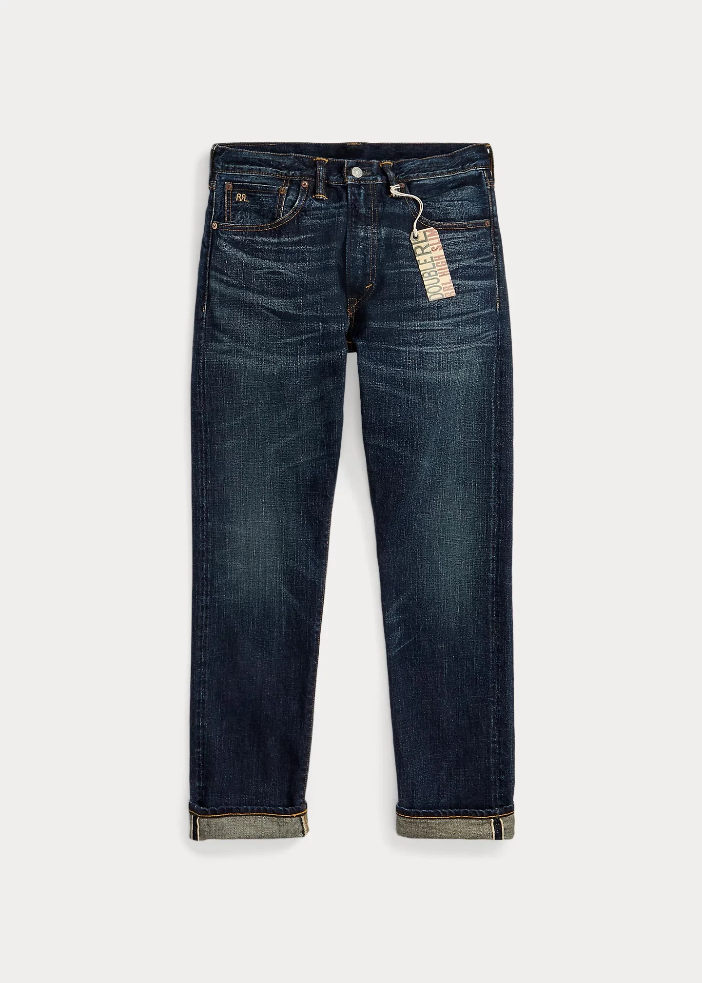 Slim-fitting jeans made in America from 16 oz. Japanese selvedge denim. Zip-fly construction. Hand-finished in a process that involves up to 50 individual steps using specialized tools and techniques. Sanforized® to minimize shrinkage. DETAILS - High Slim Fit: a medium rise and a slim thigh and leg. - Size 32W has a 9.5" rise and a 14.5" leg opening. - Hand-set chain-stitched waistband with inserted belt loops for added durability. Zip fly with our signature buttoned closure. - American-made buttons, rivets, and washer burrs. Five-pocket styling. "RRL" embroidery at the coin pocket. Twill pocket lining. - Leather "RRL"-debossed logo label at the back right waist. - Shell: 100% cotton. Patch: 100% leather. - Machine washable. For best results, wear 90 days without washing. - Made in USA with imported components. - Dyed with indigo, which may rub off onto fabrics, leather, and upholstery. - Style Number: 607526