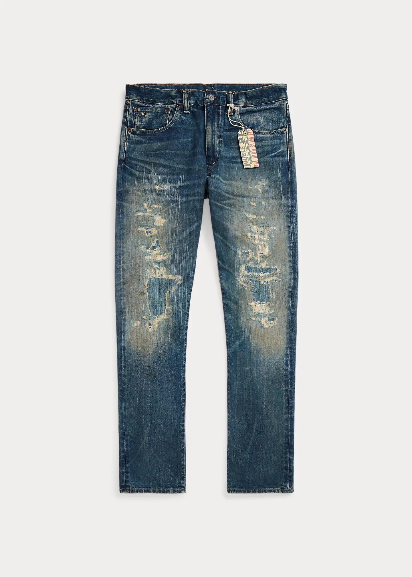 Slim-fitting jeans made from 12.75 oz. Japanese denim. Zip-fly construction. Heavily repaired. Sanforized® to minimize shrinkage. DETAILS - High Slim Fit: a medium rise and a slim thigh and leg. - Size 32W has a 9.5" rise and a 14.5" leg opening. - Hand-set, chain-stitched waistband with inserted belt loops for added durability. Zip fly with our signature buttoned closure. - American-made buttons, rivets, and washer burrs. Five-pocket styling. “RRL” embroidery at the coin pocket. - “RRL”-debossed logo label at the back right waist. - 100% cotton. - Machine washable. For best results, wear 90 days without washing. - Imported. - Dyed with true indigo, which may rub off onto fabrics, leather, and upholstery. - Style Number: 100027273