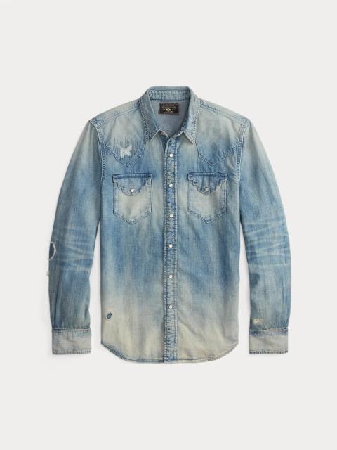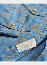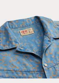Made with lightweight cotton-and-linen denim. Dyed with true indigo and discharge-printed with horseshoe and floral motifs. Details inspired by 1950s Westernwear. DETAILS - Size medium has a 24.75" front body length, a 23.75" back body length, a 19.25" shoulder, a 47.25" chest, and a 34.5" sleeve length. Sleeve length is taken from the center back of the neck. - Straight collar. Snapped placket. - Long sleeves with snapped barrel cuffs. - Two chest snapped pockets. - Adjustable snapped tabs at the back waist. - 55% cotton, 45% linen. - Machine washable. - Imported. - Dyed with true indigo, which may rub off onto fabrics, leather, and upholstery. - Style Number: 100085378