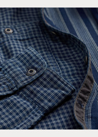 Lightweight shirt made with a breathable double-faced cotton fabric. Yarn-dyed with true indigo. Checked exterior and striped interior. Metal buttons. DETAILS - Size medium has a 29" back body length, an 18.75" shoulder, a 43.75" chest, and a 34.75" sleeve length. Sleeve length is taken from the center back of the neck. - Straight collar. Buttoned placket. Metal buttons. - Long sleeves with buttoned barrel cuffs. - Two chest buttoned pockets. - 100% cotton. - Machine washable. - Imported. - Dyed with true indigo, which may rub off onto fabrics, leather, and upholstery. - Style Number: 100058616