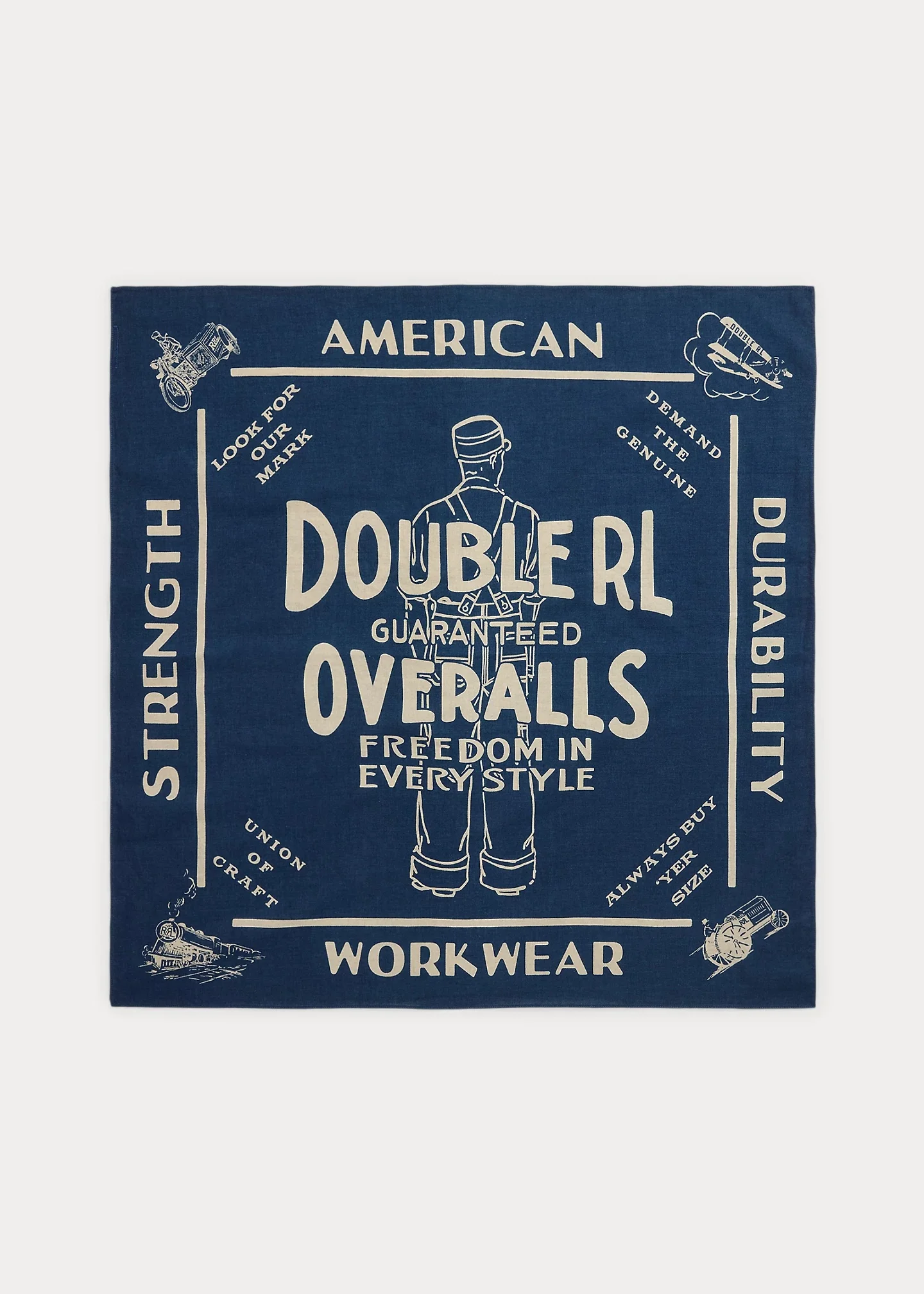Made in Japan with lightweight woven cotton. Dyed with true indigo. Discharge-printed with a Double RL overalls graphic. Rinsed and tinted. DETAILS - 24" L x 24" W. - “Double RL Overalls Guaranteed Freedom in Every Style" printed at the center. “American,” “Durability,” “Workwear,” and “Strength” printed at the borders. - Cotton. - Hand wash. - Made in Japan. - Dyed with true indigo, which may rub off onto fabrics, leather, and upholstery. - Style Number: 100048683