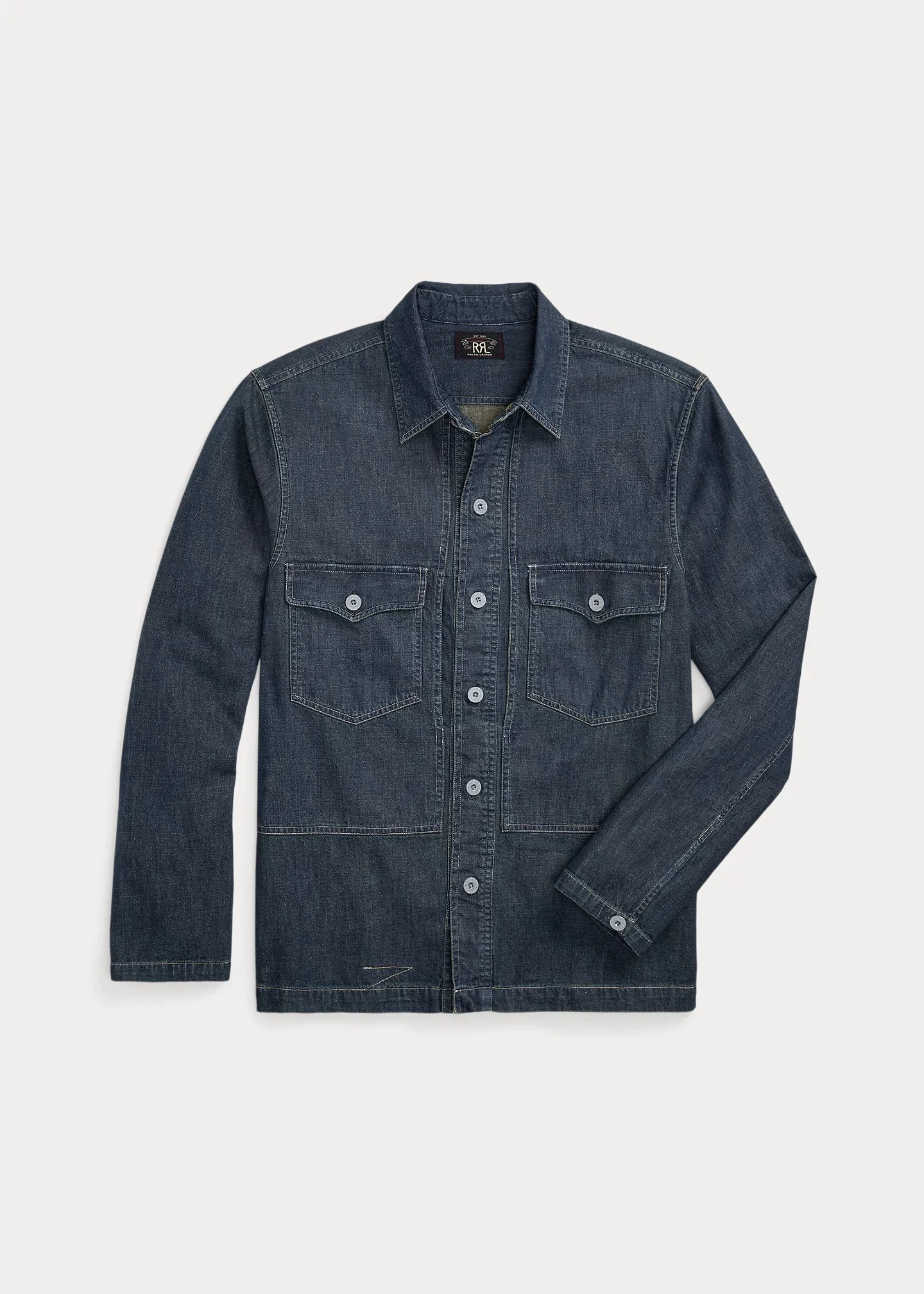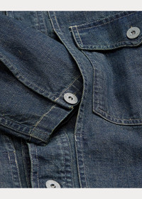 Boxy-fitting overshirt made from denim that is woven to achieve a unique nep texture. Dyed with true indigo. Details inspired by ’40s surplus garments. Metal buttons. DETAILS - Boxy fit. - Size medium has a 27.75" back body length, a 19.25" shoulder, a 45" chest, and a 34.75" sleeve length. Sleeve length is taken from the center back of the neck. - Straight collar. Buttoned placket. Metal buttons. - Long sleeves with buttoned barrel cuffs. - Two chest buttoned pockets. Straight hem. - 100% cotton. - Machine washable. - Imported. - Dyed with true indigo, which may rub off onto fabrics, leather, and upholstery. - Style Number: 100007925