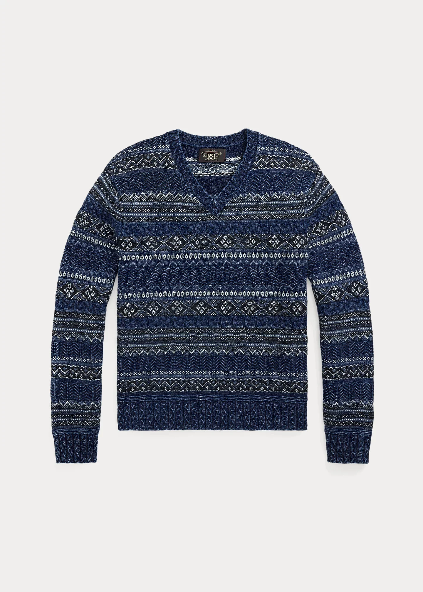 Knit with indigo-dyed cotton and linen yarns. Nautical-inspired mixed cable and novelty stitches throughout. Zig-zag stitching at the ribbed V-neck, cuffs, and hem. DETAILS - Size medium has a 26" body length, a 17.5" shoulder, a 41.25" chest, and a 25" sleeve length. - Rib-knit V-neck with zig-zag stitching. - Long sleeves. Rib-knit cuffs with zig-zag stitching. - Rib-knit hem with zig-zag stitching. - 81% cotton, 19% linen. - Machine washable. - Imported. - Dyed with indigo, which may rub off onto fabrics, leather, and upholstery. - Style Number: 100056216