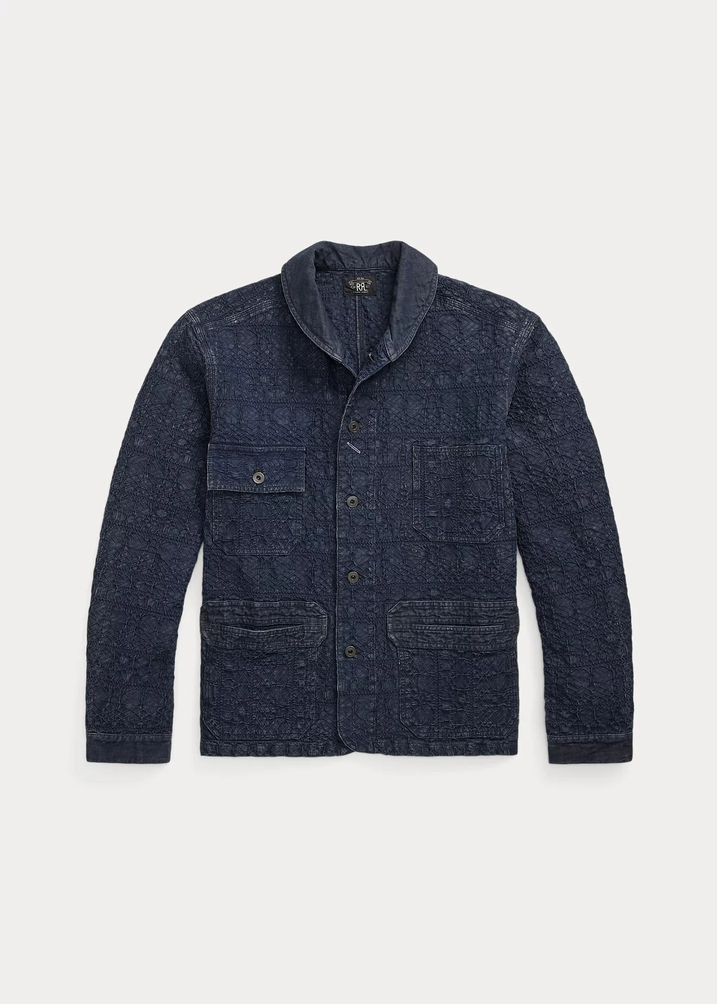 Made from a textured jacquard-woven fabric that is dyed with true indigo. Denim collar, cuffs, and pocket reinforcements. Vintage-inspired metal buttons. Washed to achieve tonal dimension. DETAILS - Overshirt fit. - Size medium has a 27.25" back body length, a 19" shoulder, a 46.75" chest, and a 35.5" sleeve length. Sleeve length is taken from the center back of the neck. - Shawl collar. Buttoned placket. Metal buttons. - Long sleeves with buttoned barrel cuffs. - Left chest patch pocket. Right chest buttoned pocket. Two front waist patch pockets. Interior left chest pocket. - 76% cotton, 23% polyester, 1% elastane. - Machine washable. - Imported. - Dyed with true indigo, which may rub off onto fabrics, leather, and upholstery. - Style Number: 100056589