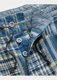 Relaxed-fitting cargo pants with a wide leg. Cotton-and-linen patchwork design composed of plaid, striped, and chambray fabrics that are inspired by vintage textiles. Yarn-dyed with true indigo. Drawstring waist and hems. Metal buttons with a corroded finish. Washed to achieve tonal dimension and an authentic timeworn effect. DETAILS - Relaxed fit with a wide leg and long rise. - Size 32W has an 11.75" rise and a 19.5" leg opening. - Drawstring waistband. Button fly with a buttoned closure. Metal buttons. - Side on-seam pockets. Two back buttoned pockets. - Reinforced stitching at the seat. - Drawstring hems. - 70% cotton, 30% linen. - Machine washable. Imported. - Dyed with true indigo, which may rub off onto fabrics, leather, and upholstery. - Style Number: 100044078